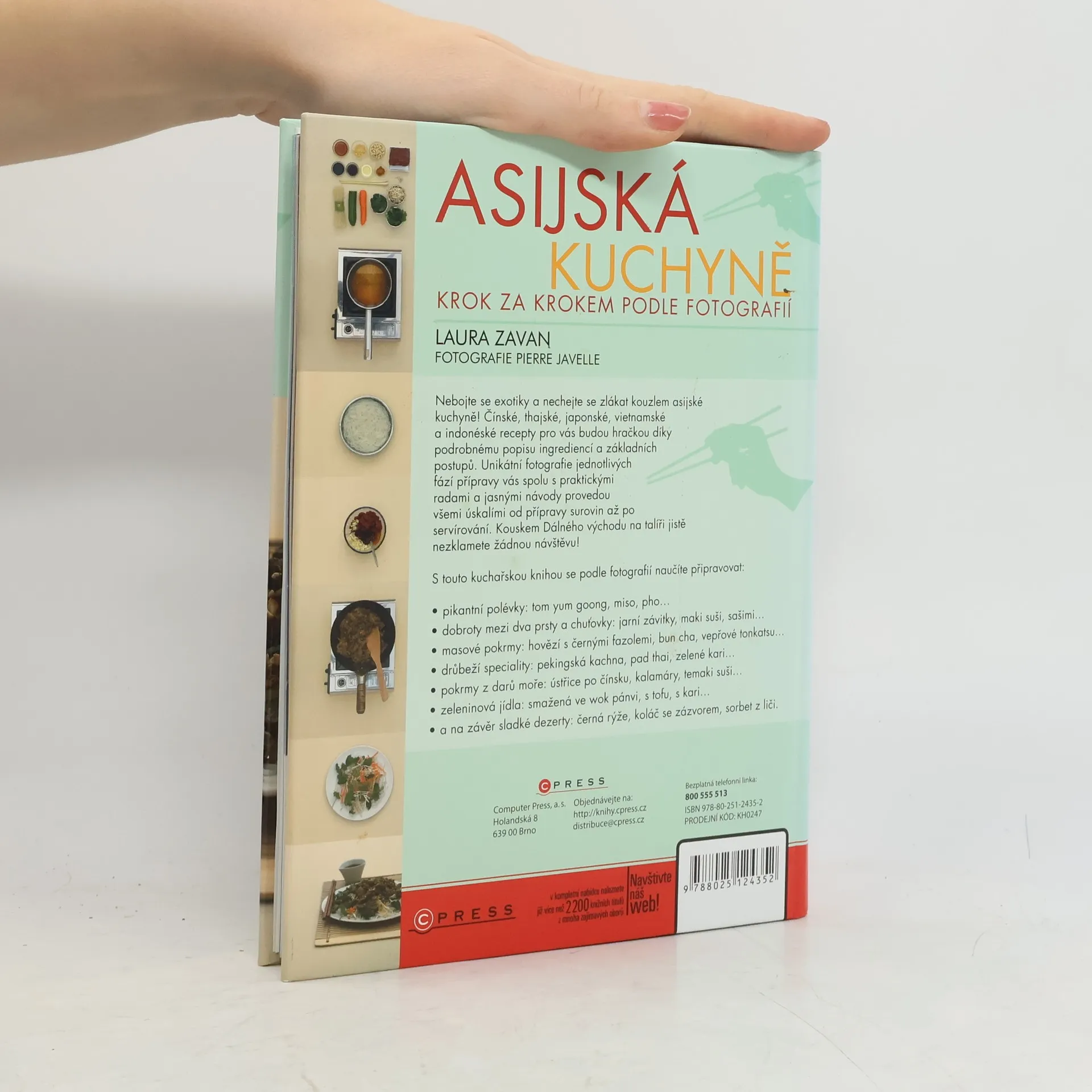 Nebojte se exotiky a nechejte se zlákat kouzlem asijské kuchyně! Čínské, thajské, japonské, vietnamské a indonéské recepty pro vás budou hračkou díky podrobnému popisu ingrediencí a základních postupů. Unikátní fotografie jednotlivých fází přípravy vás spolu s praktickými radami a jasnými návody provedou všemi úskalími od přípravy surovin až po servírování. Kouskem Dálného východu na talíři jistě nezklamete žádnou návštěvu! Recepty asijské kuchyně s krásnými a návodnými fotografiemi.