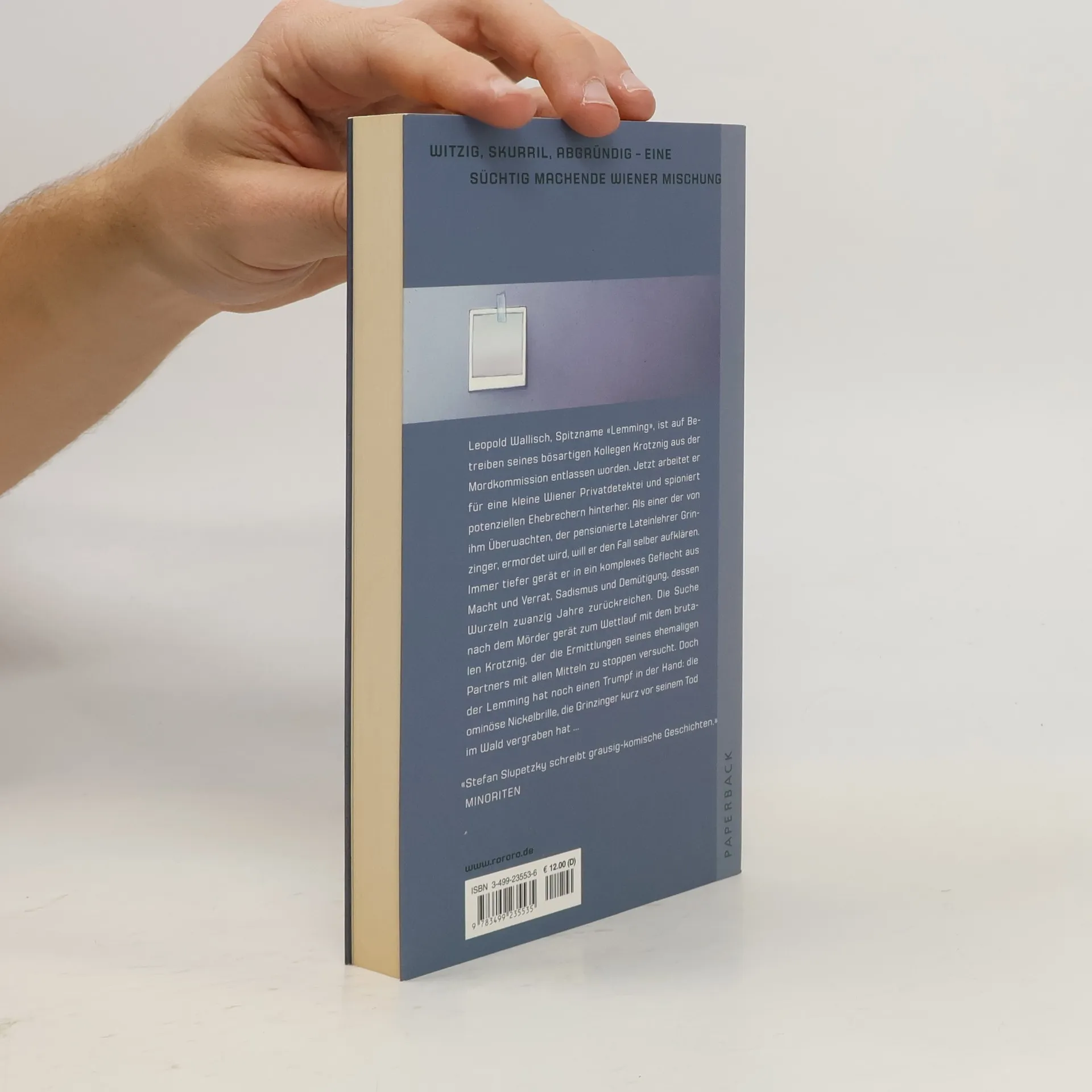 Witzig, skurril, abgründig – eine süchtigmachende Wiener Mischung Leopold Wallisch, Spitzname “Lemming” ist auf Betreiben seines bösartigen Kollegen Krotznig aus der Mordkommission entlassen worden. Jetzt arbeitet er für eine kleine Wiener Privatdetektei und spioniert potentiellen Ehebrechern hinterher. Als einer der von ihm Überwachten, der pensionierte Lateinlehrer Grinzinger, ermordet wird, will er den Fall selber aufklären. Immer tiefer gerät er in ein komplexes Geflecht aus Macht und Verrat, Sadismus und Demütigung, dessen Wurzeln zwanzig Jahre zurückreichen.Die Suche nach dem Mörder gerät zum Wettlauf mit dem brutalen Krotznig, der die Ermittlungen seines ehemaligen Partners mit allen Mitteln zu stoppen versucht. Doch der Lemming hat noch einen Trumpf in der Hand: die ominöse Nickelbrille, die Grinziger kurz vor seinem Tod im Wald vergraben hat...“Stefan Slupetzky schreibt grausig komische Geschichten” (Minoriten)