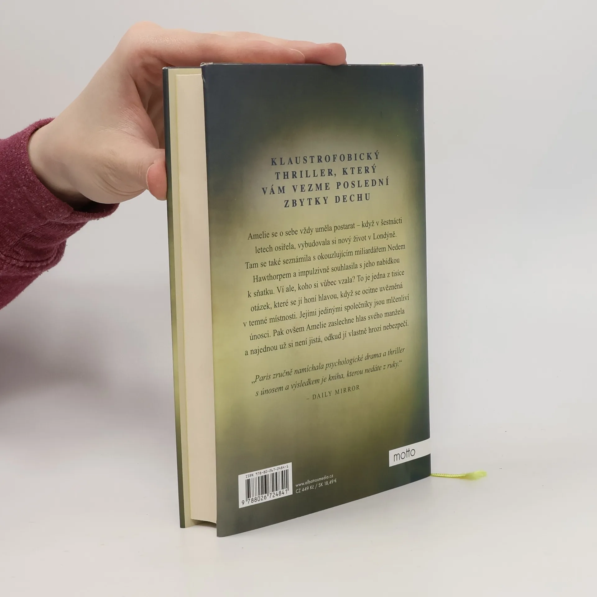 Klaustrofobický thriller, který vám vezme poslední zbytky dechu. Amelie se o sebe vždy uměla postarat – když v šestnácti letech osiřela, vybudovala si nový život v Londýně. Tam se taky seznámila s okouzlujícím miliardářem Nedem Hawthorpem a impulzivně souhlasila s jeho nabídkou k sňatku. Ví ale, koho si vůbec vzala? To je jedna z tisíce otázek, které se jí honí hlavou, když se ocitne uvězněná v temné místnosti. Jejími jedinými společníky jsou mlčenliví únosci. Pak ovšem Amelie zaslechne hlas svého manžela a najednou už si není jistá, odkud jí vlastně hrozí nebezpečí.