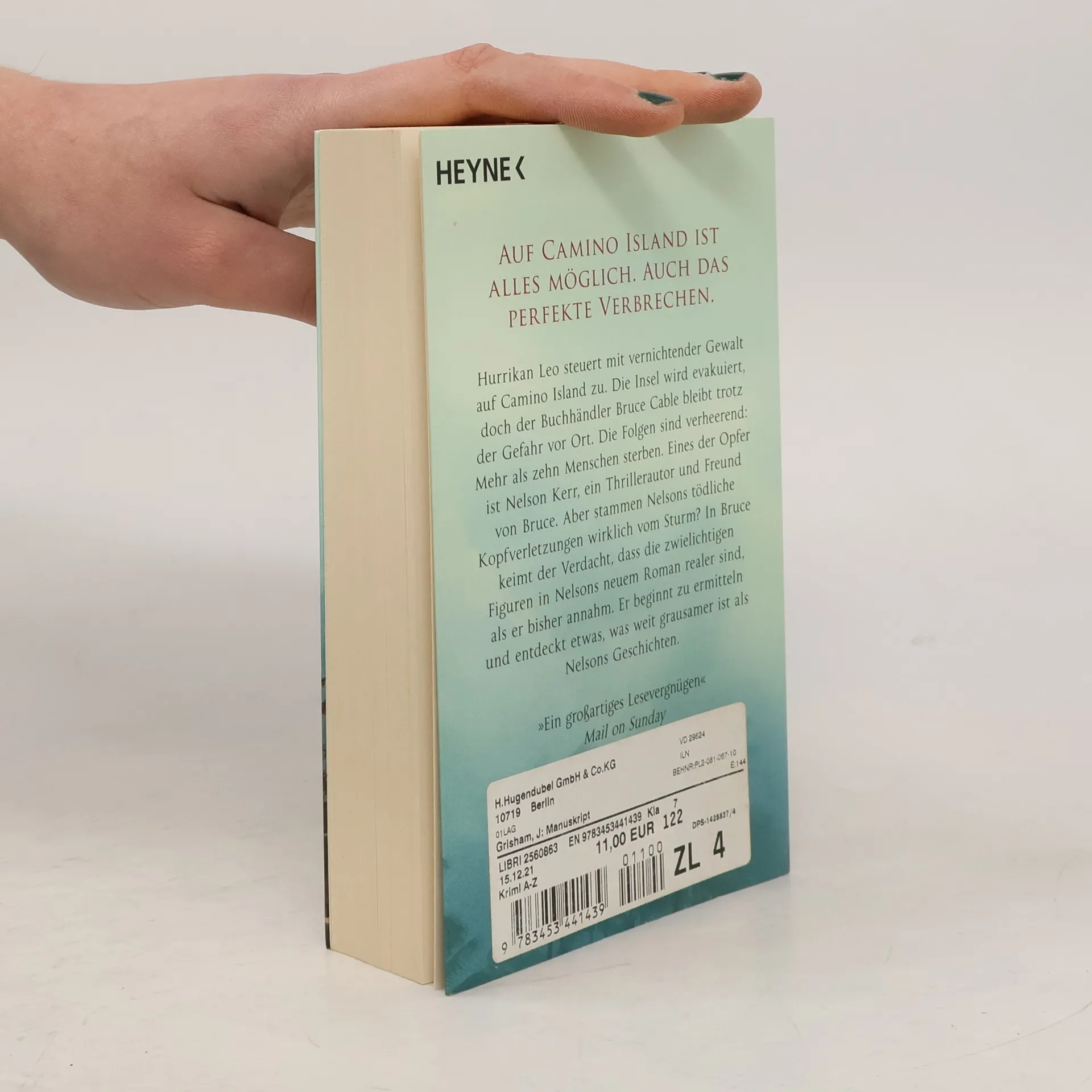 Auf Camino Island ist alles möglich. Auch das perfekte Verbrechen. Hurrikan Leo steuert mit vernichtender Gewalt auf Camino Island zu. Die Insel wird evakuiert, doch der Buchhändler Bruce Cable bleibt trotz der Gefahr vor Ort. Leos Folgen sind verheerend: Mehr als zehn Menschen sterben. Eines der Opfer ist Nelson Kerr, ein Thrillerautor und Freund von Bruce. Aber stammen Nelsons tödliche Kopfverletzungen wirklich vom Sturm? In Bruce keimt der Verdacht, dass die zwielichtigen Figuren in Nelsons neuem Roman realer sind, als er bisher annahm. Er beginnt zu ermitteln und entdeckt etwas, was weit grausamer ist als Nelsons Geschichten.