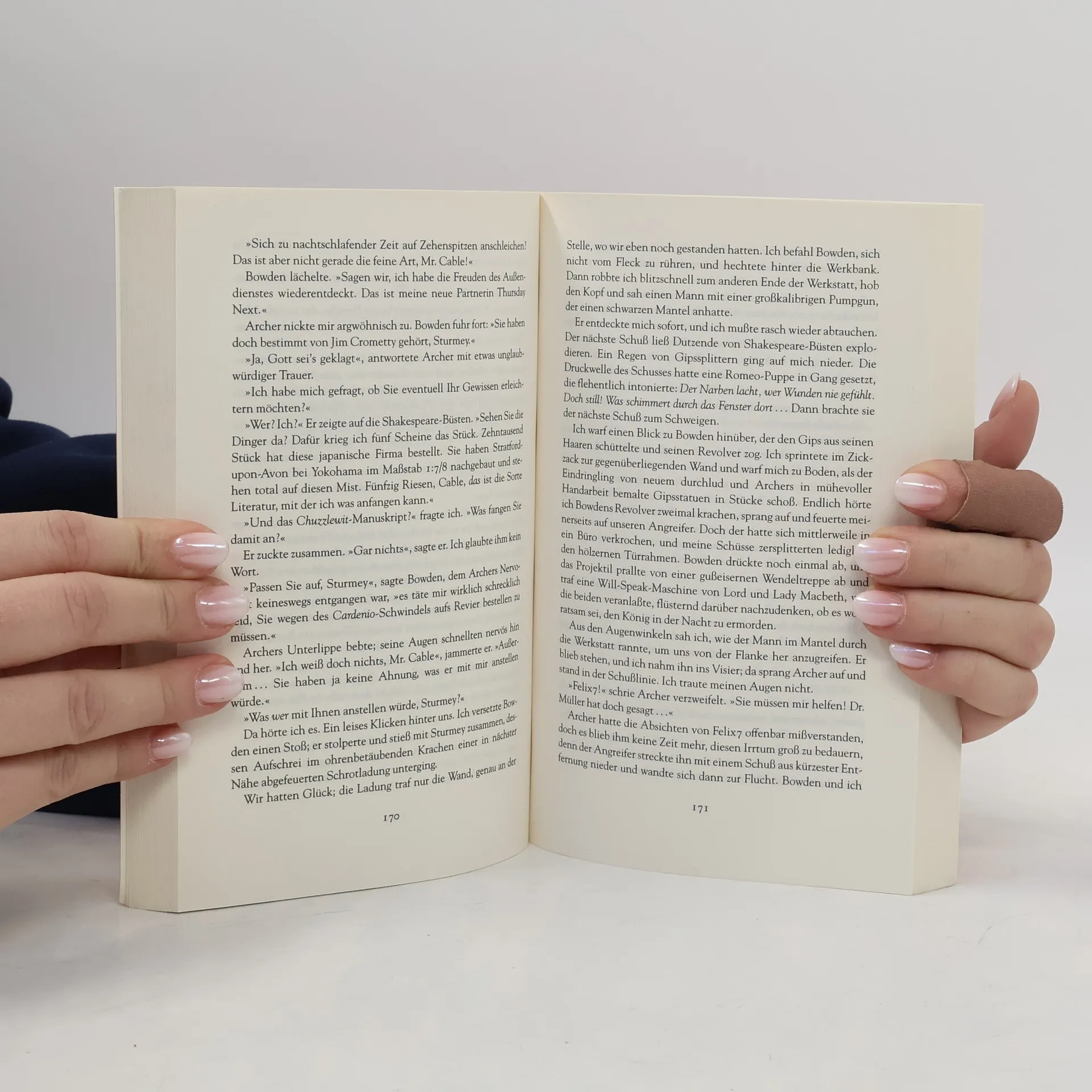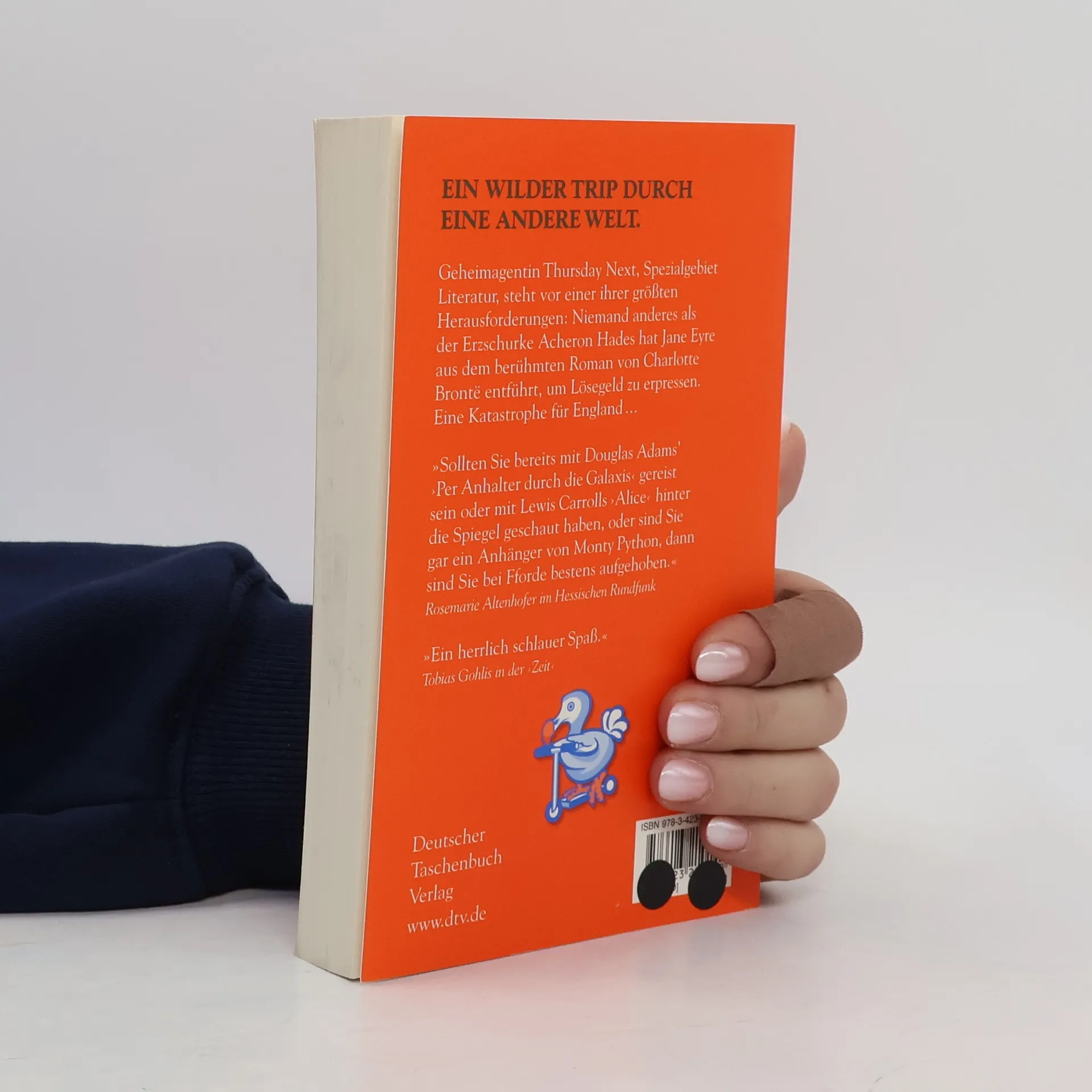 Können Sie sich eine Welt vorstellen, in der Literatur so wichtig genommen wird, dass es eine Spezialpolizei gibt, um sie vor Fälschern zu schützen? Als Geheimagentin Thursday Next ihre neue Stelle in Swindon antritt, ahnt sie schon, daß ihr die größte Herausforderung ihrer Karriere bevorsteht: Niemand anderes als der Erzschurke Acheron Hades hat Jane Eyre aus dem berühmten Roman von Charlotte Brontë entführt, um Lösegeld zu erpressen. Eine Katastrophe für England, das mit dem seit 130 Jahren tobenden Krimkrieg schon genug Sorgen hat. Aber Thursday Next ist eine Superagentin: clever und unerschrocken. Und wenn sie wirklich mal in die Klemme gerät, kommt aus dem Nichts ihr von den Chronoguards desertierter, ziemlich anarchistischer Vater, um für ein paar Minuten die Zeit anzuhalten.