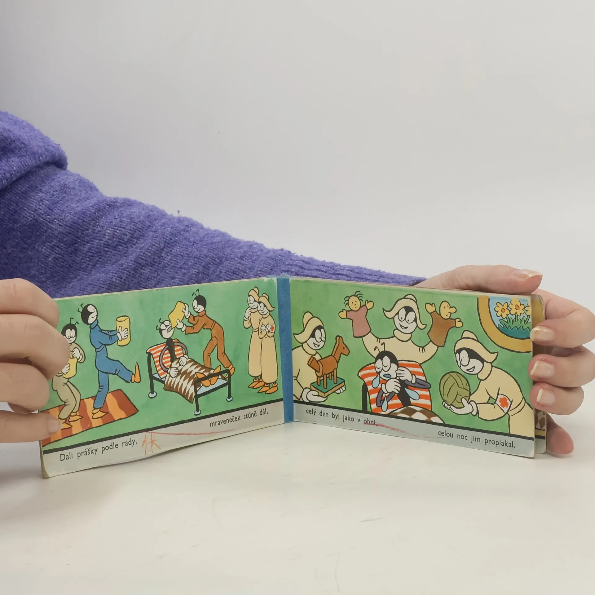 Veršovaný příběh s dobrým koncem o tom, jak polámaného mravenečka nevyléčí prášky mravenčího doktora, ale soucit a porozumění dobrých přátel.