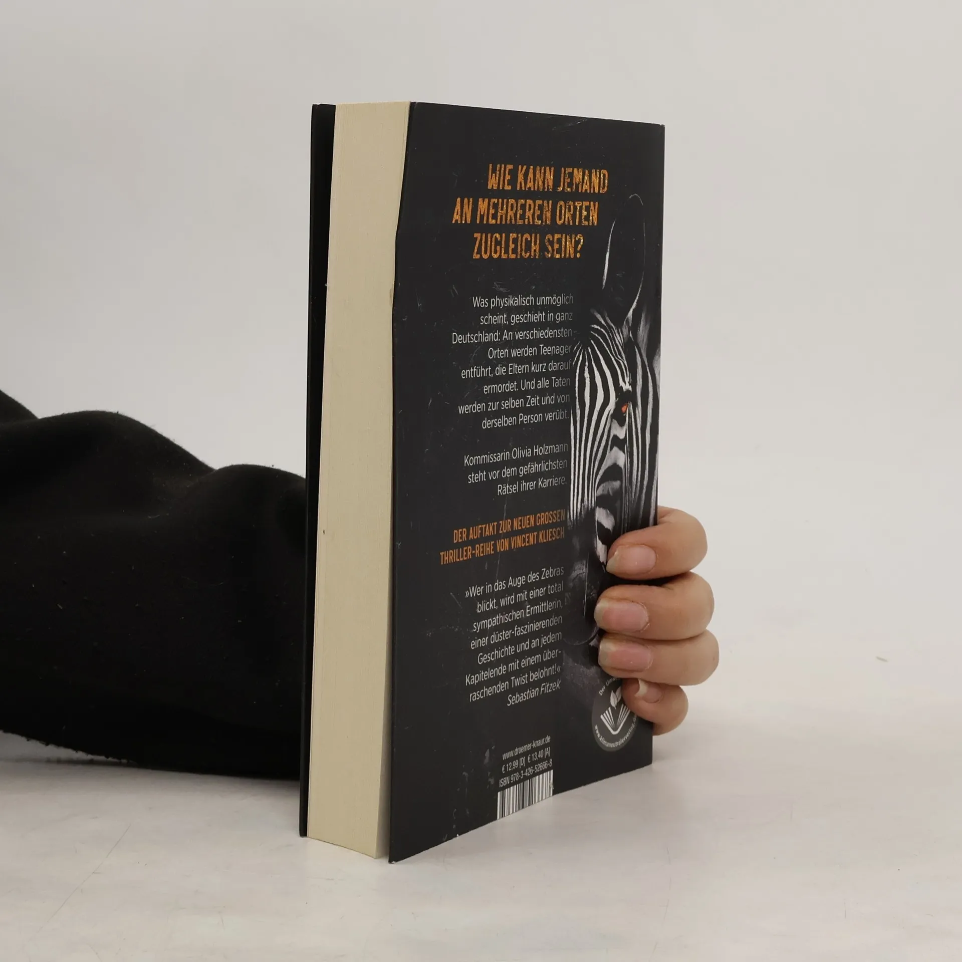 Wer in das Auge des Zebras blickt, wird mit einer sympathischen Ermittlerin, einer düster-faszinierenden Geschichte und überraschenden Twists belohnt! Im Auftakt der Reihe muss Kommissarin Olivia Holzmann einen Fall lösen, der physikalisch unmöglich erscheint. In ganz Deutschland verschwinden Teenager, während ihre Eltern ermordet werden. Alle Beweise deuten darauf hin, dass die Taten zur selben Zeit und von derselben Person begangen wurden. Olivia vom LKA Berlin steht vor einem Rätsel, denn die Zeit drängt für die Jugendlichen. Um diesen übernatürlichen Fall zu knacken, benötigt sie die Fähigkeiten dreier besonderer Ermittler: ihre eigene Willensstärke, die geniale Beobachtungsgabe ihres Mentors Severin Boesherz und die Erfahrung der pensionierten Kommissarin Esther Wardy. Doch sie ahnen nicht, wie leicht der Täter ihnen das Liebste nehmen kann. Ein genialer Psychopath, ein unmöglicher Fall und unvorhersehbare Wendungen erwarten die Leser. Der deutsche Thriller-Autor Vincent Kliesch, bekannt für die Bestsellerreihe "Auris" zusammen mit Sebastian Fitzek, wird mit der neuen Ermittlerin Olivia Holzmann für viele schlaflose Nächte sorgen!