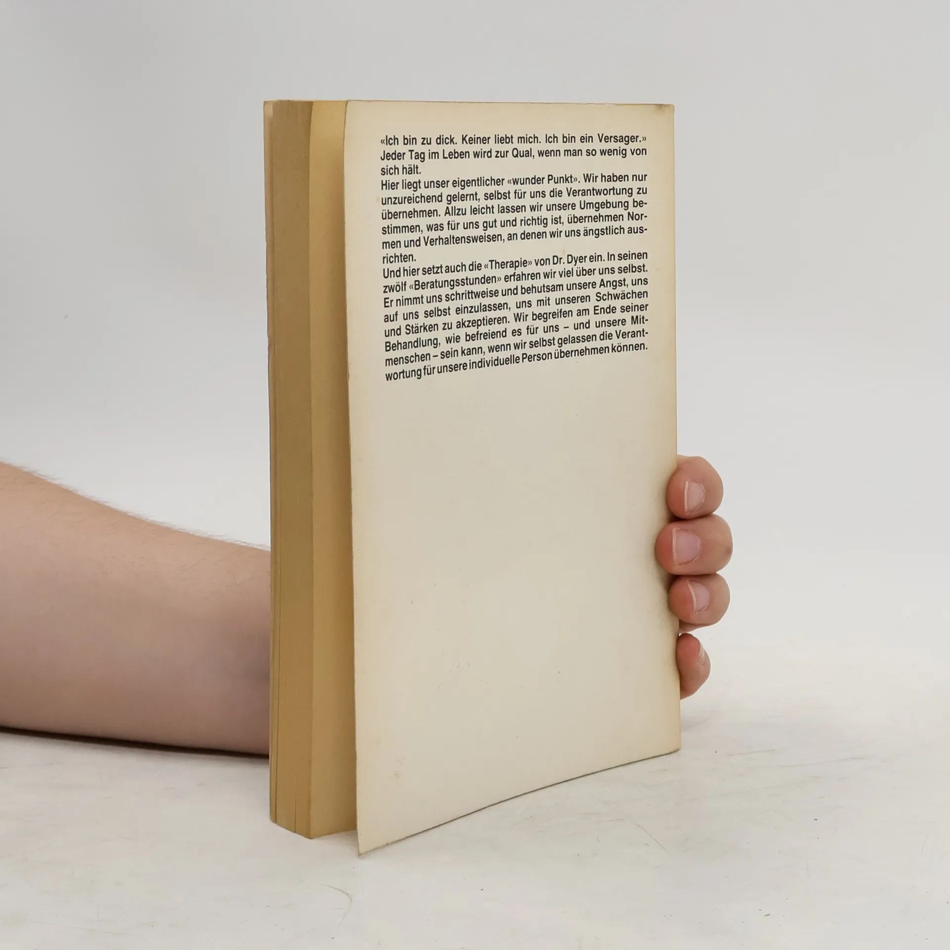 «Ich bin zu dick. Keiner liebt mich. Ich bin ein Versager.» Jeder Tag im Leben wird zur Qual, wenn man so wenig von sich hält. Hier liegt unser eigentlicher «wunder Punkt». Wir haben nur unzureichend gelernt, selbst für uns die Verantwortung zu übernehmen. Allzu leicht lassen wir unsere Umgebung bestimmen, was für uns gut und richtig ist, übernehmen Normen und Verhaltensweisen, an denen wir uns ängstlich ausrichten. Und hier setzt auch die «Therapie» von Dr. Dyer ein. In seinen zwölf «Beratungsstunden» erfahren wir viel über uns selbst. Er nimmt uns schrittweise und behutsam unsere Angst, uns auf uns selbst einzulassen, uns mit unseren Schwächen und Stärken zu akzeptieren. Wir begreifen am Ende seiner Behandlung, wie befreiend es für uns - und unsere Mitmenschen - sein kann, wenn wir selbst gelassen die Verantwortung für unsere individuelle Person übernehmen können.