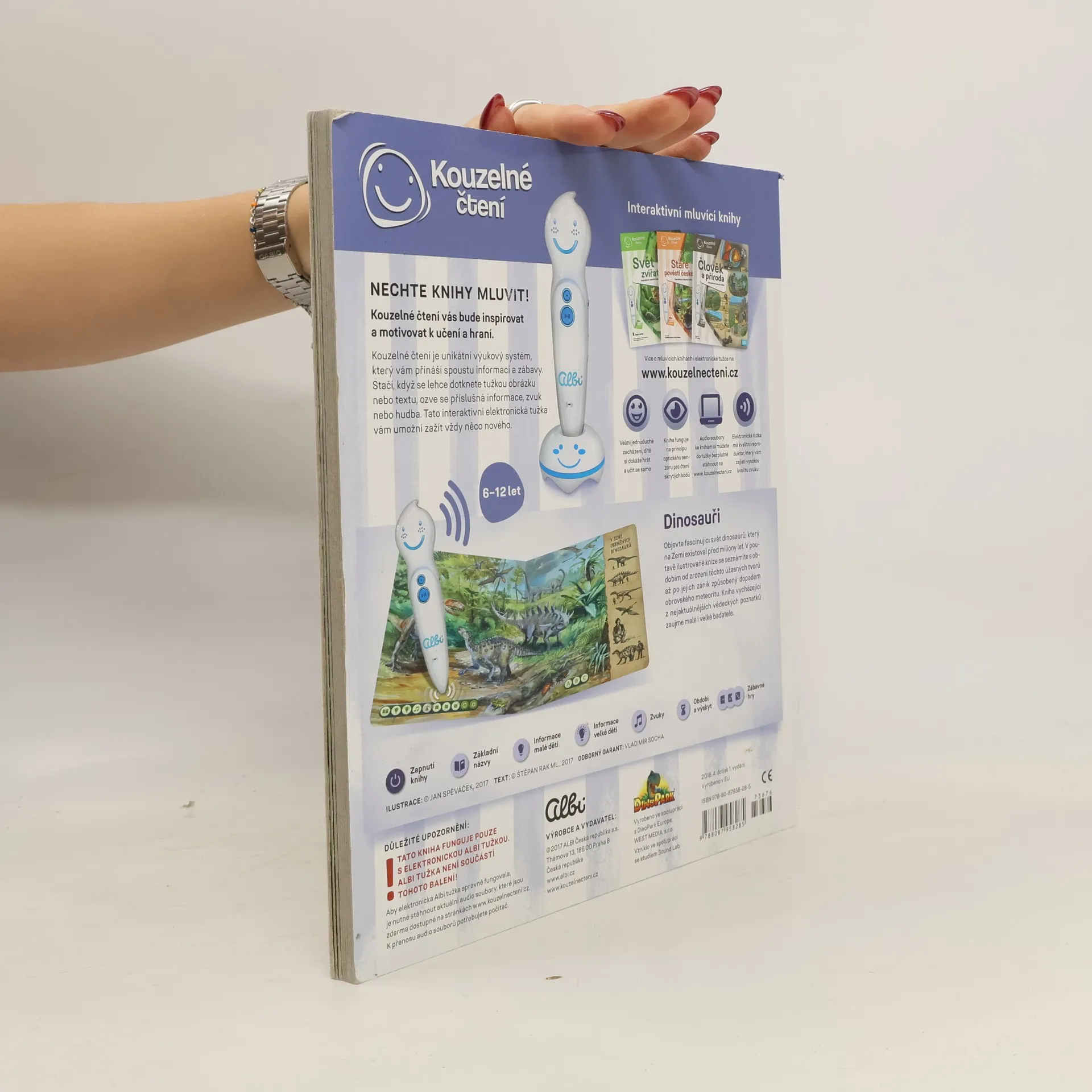 Kniha Dinosauři z edice Kouzelné čtení provede čtenáře od zrodu prvních dinosaurů přes druhohory, kdy dinosauři ovládli svět a dosáhli gigantických rozměrů, až k jejich zániku způsobeného dopadem obrovského meteoritu. Kniha dětem ukáže, jak dinosauři vypadali podle nejaktuálnějších vědeckých poznatků včetně zvuků, které mohli vydávat. Dinosauři osloví jak nejmenší děti od 6 let, tak i starší děti, které se již aktivně o prehistorický svět zajímají. Kniha Dinosauři obsahuje přes 1 700 zvuků a textů. Ilustrace: Jan Spěváček Text: Štěpán Rak ml. Odborný garant: Vladimír Socha Namluvil: Alfred Strejček Kniha byla vyrobena ve spolupráci s DinoPark Europe, WEST MEDIA, s.r.o. a studiem SoundLab.