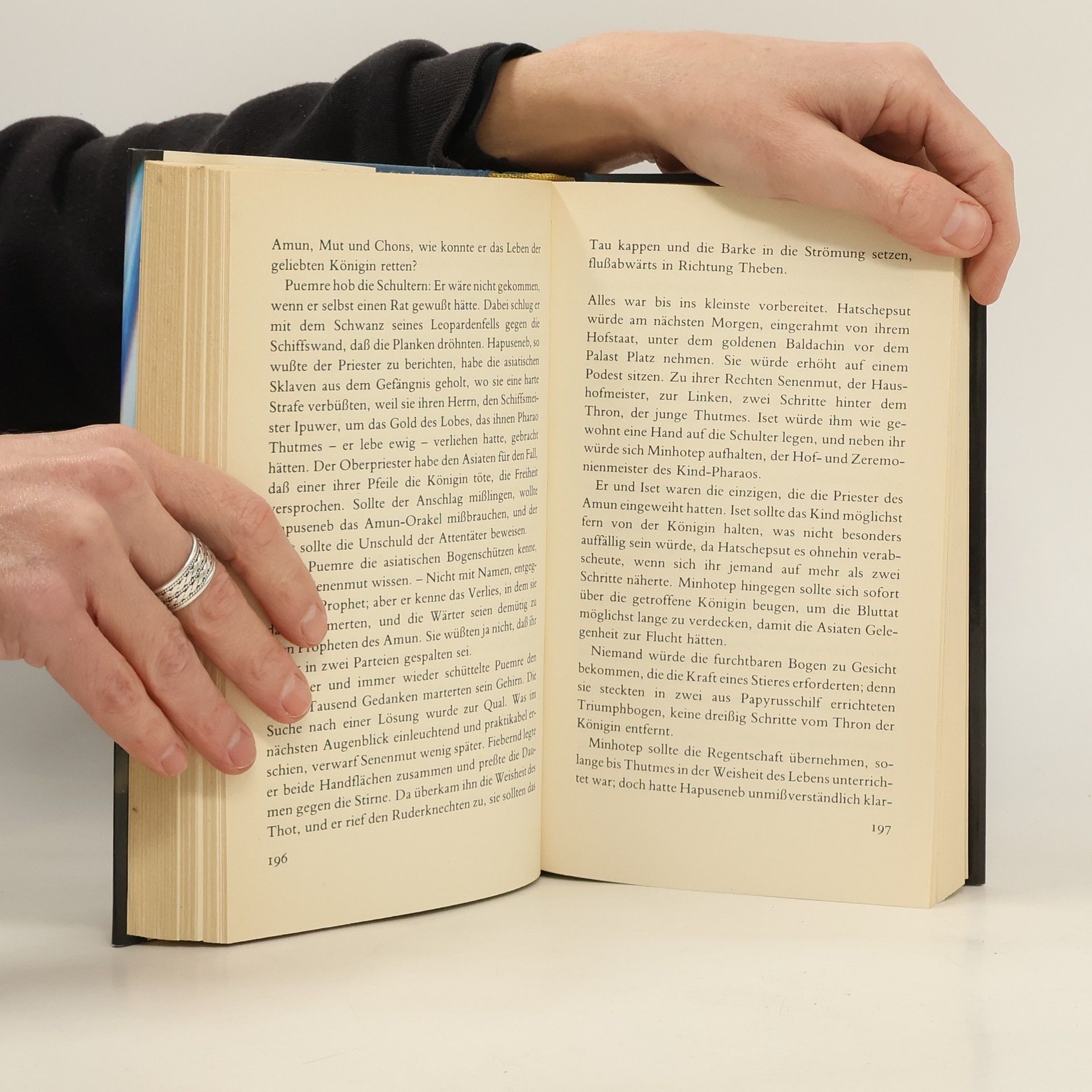 Um ihre Macht zu sichern, krönt Hatschepsut sich nach dem Tod ihres verhassten Ehemanns Thutmes selbst zur Pharaonin. Sie feiert die prächtigsten Feste, baut Tempel und Obelisken und regiert härter als alle Männer vor ihr. Auch Liebe findet sie: in den Armen des Baumeisters Senenmut. Doch ihr strenges Regiment bewahrt sie nicht vor Feinden: In den verschlagenen Amun-Priestern hat sie mächtige Gegner, und Teti, der geheimnisvolle Arzt und Magier, schreckt vor nichts zurück, um selbst auf den Pharaonenthron gelangen.