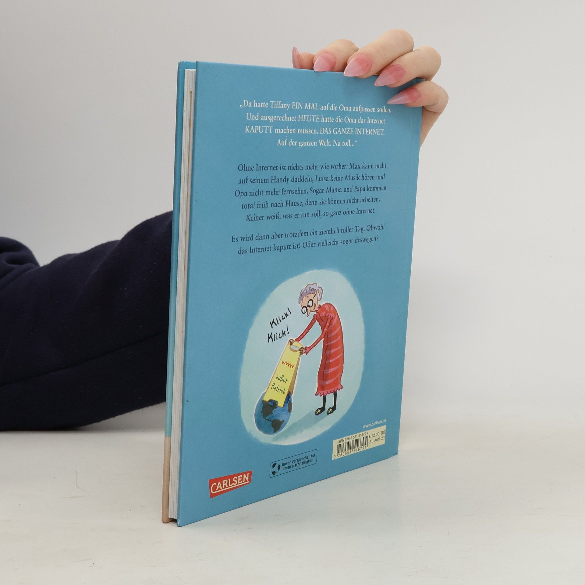 Das erste Kinderbuch von Marc-Uwe Kling! Das gibt's doch gar nicht, oder? Oma hat das Internet kaputt gemacht. Und zwar das ganze. Auf der ganzen Welt! Tiffany, Max und Luisa kommen aus dem Staunen gar nicht mehr raus, denn tatsächlich geht ... nichts mehr! Zuerst ist das ganz schön komisch. Denn plötzlich haben alle Zeit. Doch dann wird es richtig gemütlich, obwohl das Internet nicht funktioniert – oder vielleicht auch gerade deshalb. Lachmuskeltraining für die ganze Familie! Spiegel-Bestseller Platz 1 aller Vorlesebücher Ausgezeichnet mit dem „Leselotsen“ Oktober 2018 vom Börsenblatt des deutschen Buchhandels!