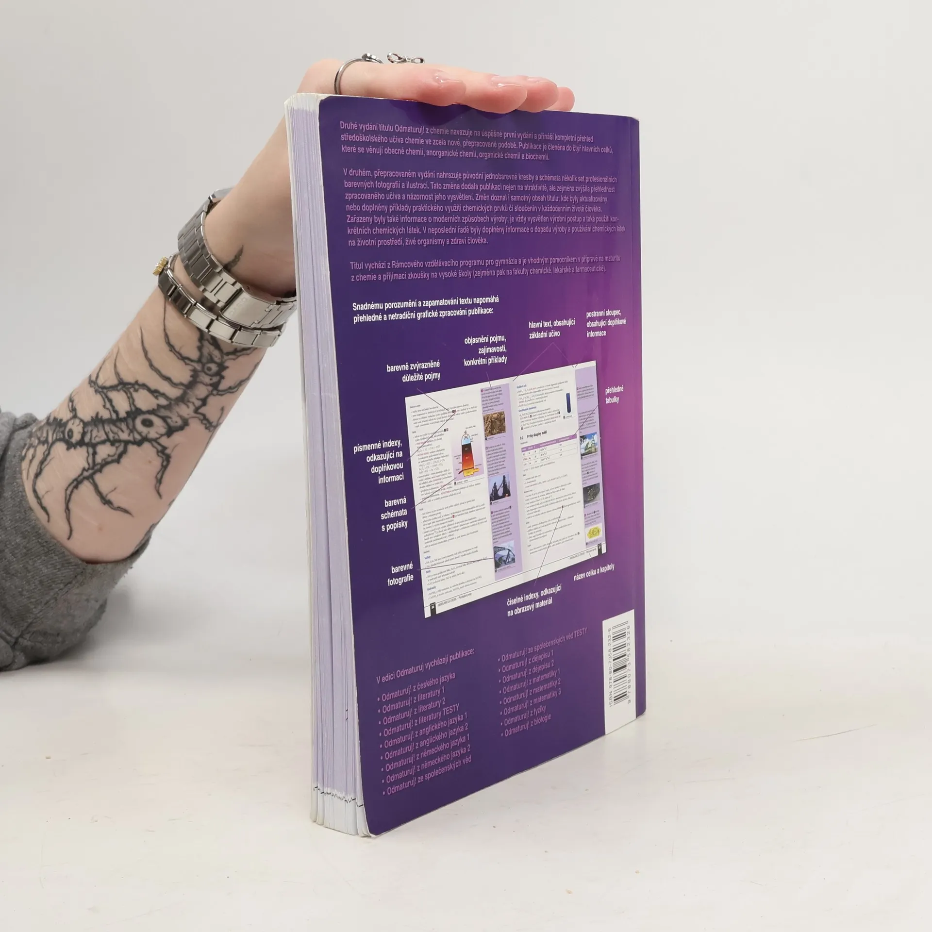 •Poutavá učebnice určená k přípravě na maturitu (i k nové podobě maturity) a k přijímacím zkouškám na vysoké školy. •Obsahuje celou středoškolskou látku chemie, poznatky z obecné chemie, anorganické a organické chemie a biochemie. •Kniha je přehledně zpracována do 38 kapitol, které jsou dále členěny na menší podkapitoly, příp. i menší tematické celky. •Snadnou orientaci v textu podporuje grafické odlišení ústředního textu od doplňujících poznámek a zajímavostí a barevné zvýraznění základních pojmů. •Text je doplněn mnoha přehlednými tabulkami a názornými schématy. •Určeno studentům všech středních škol během celého středoškolského studia, jejich učitelům a ostatním zájemcům o studium chemie.