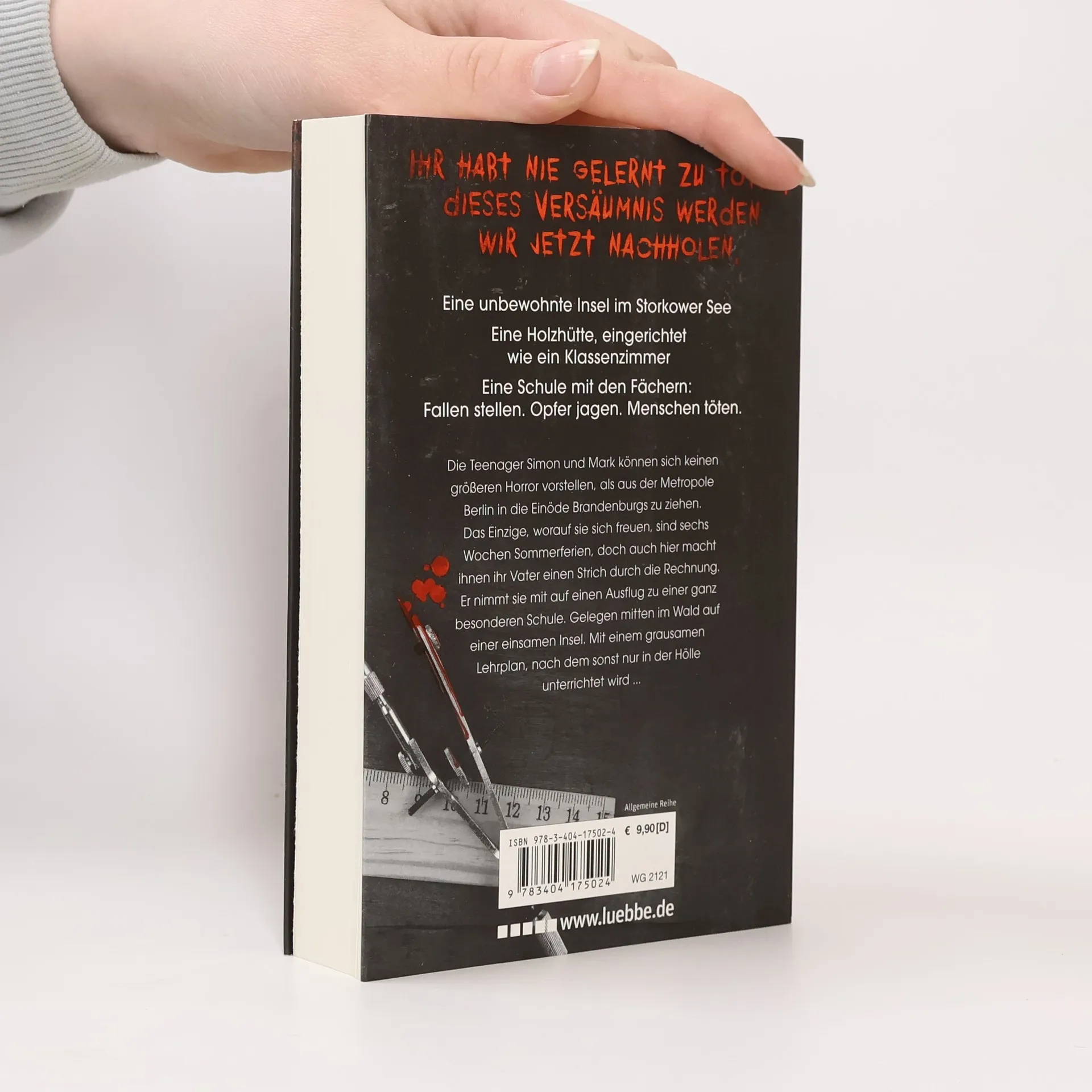 Eine unbewohnte Insel im Storkower See Eine Holzhütte, eingerichtet wie ein Klassenzimmer Eine Schule mit den Fächern: Fallen stellen. Opfer jagen. Menschen töten. Die Teenager Simon und Mark können sich keinen größeren Horror vorstellen, als aus der Metropole Berlin in die Einöde Brandenburgs zu ziehen. Das Einzige, worauf sie sich freuen, sind sechs Wochen Sommerferien, doch auch hier macht ihnen ihr Vater einen Strich durch die Rechnung. Er nimmt sie mit auf einen Ausflug zu einer ganz besonderen Schule. Gelegen mitten im Wald auf einer einsamen Insel. Mit einem grausamen Lehrplan, nach dem sonst nur in der Hölle unterrichtet wird ...