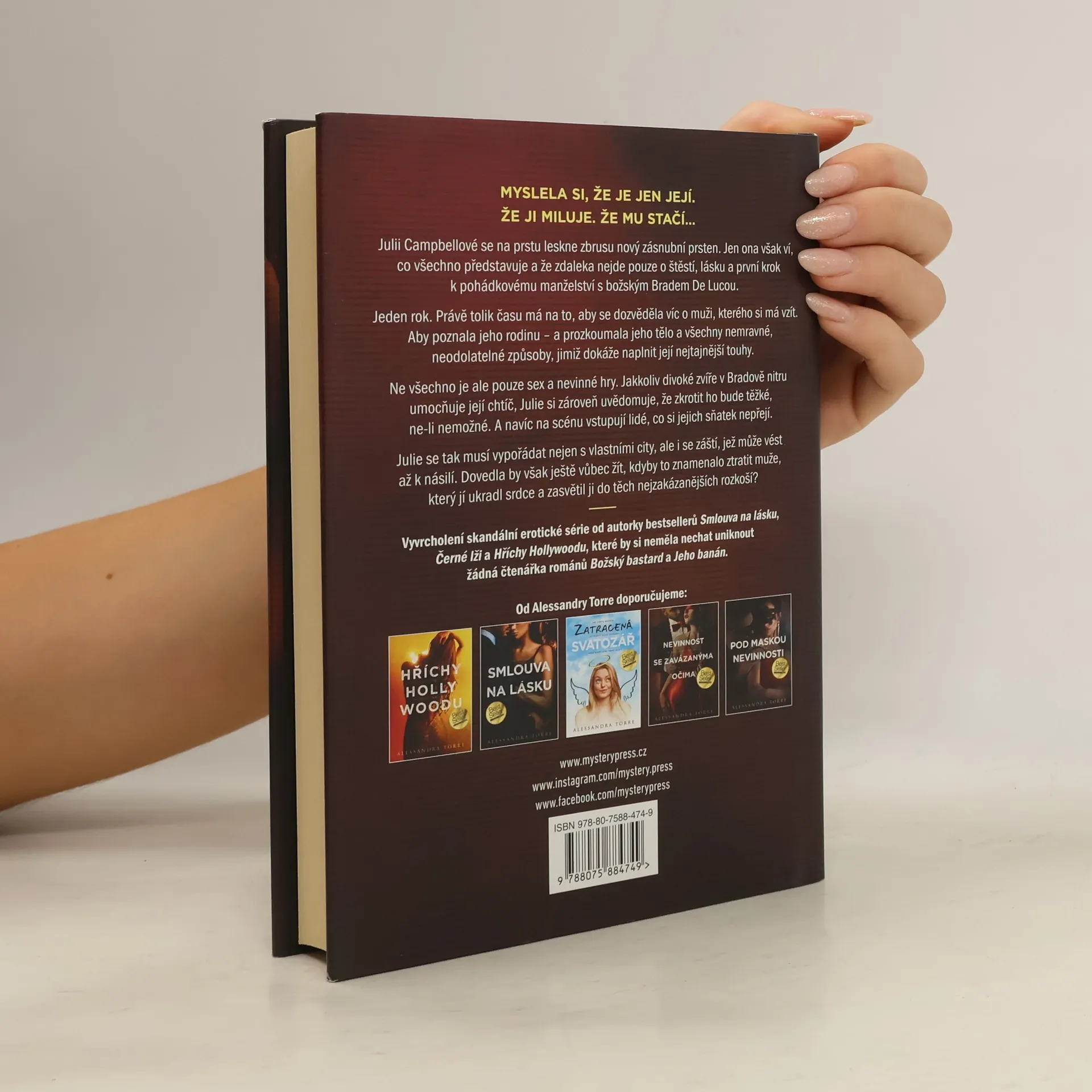 MYSLELA SI, ŽE JE JEN JEJÍ. ŽE JI MILUJE. ŽE MU STAČÍ…Julii Campbellové se na prstu leskne zbrusu nový zásnubní prsten. Jen ona však ví, co všechno představuje a že zdaleka nejde pouze o štěstí, lásku a první krok k pohádkovému manželství s božským Bradem De Lucou.Jeden rok. Právě tolik času má na to, aby se dozvěděla víc o muži, kterého si má vzít. Aby poznala jeho rodinu – a prozkoumala jeho tělo a všechny nemravné, neodolatelné způsoby, jimiž dokáže naplnit její nejtajnější touhy.Ne všechno je ale pouze sex a nevinné hry. Jakkoliv divoké zvíře v Bradově nitru umocňuje její chtíč, Julie si zároveň uvědomuje, že zkrotit ho bude těžké, ne-li nemožné. A navíc na scénu vstupují lidé, co si jejich sňatek nepřejí.Julie se tak musí vypořádat nejen s vlastními city, ale i se záští, jež může vést až k násilí. Dovedla by však ještě vůbec žít, kdyby to znamenalo ztratit muže, který jí ukradl srdce a zasvětil ji do těch nejzakázanějších rozkoší?___Vyvrcholení skandální erotické série od autorky bestsellerů Smlouva na lásku, Černé lži a Hříchy Hollywoodu, které by si neměla nechat uniknout žádná čtenářka románů Božský bastard a Jeho banán.