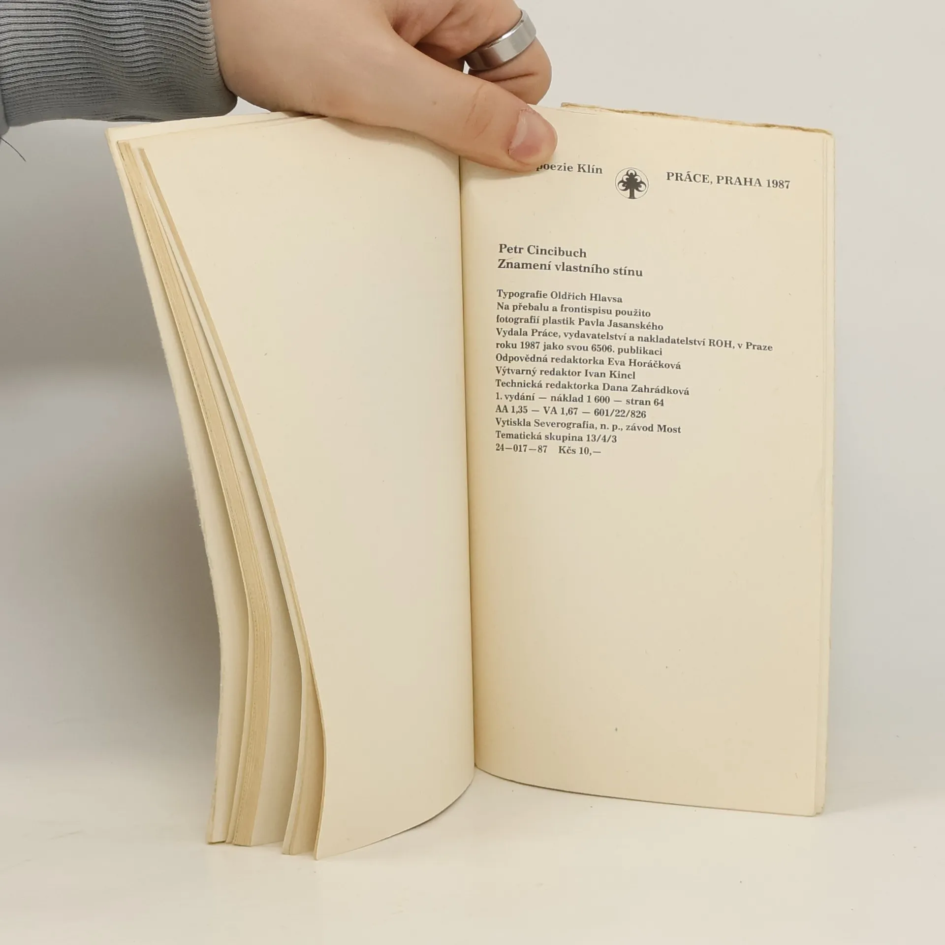 Sbírka básní. Na přebalu a frontispisu použito fotografií plastik Pavla Jasanského.