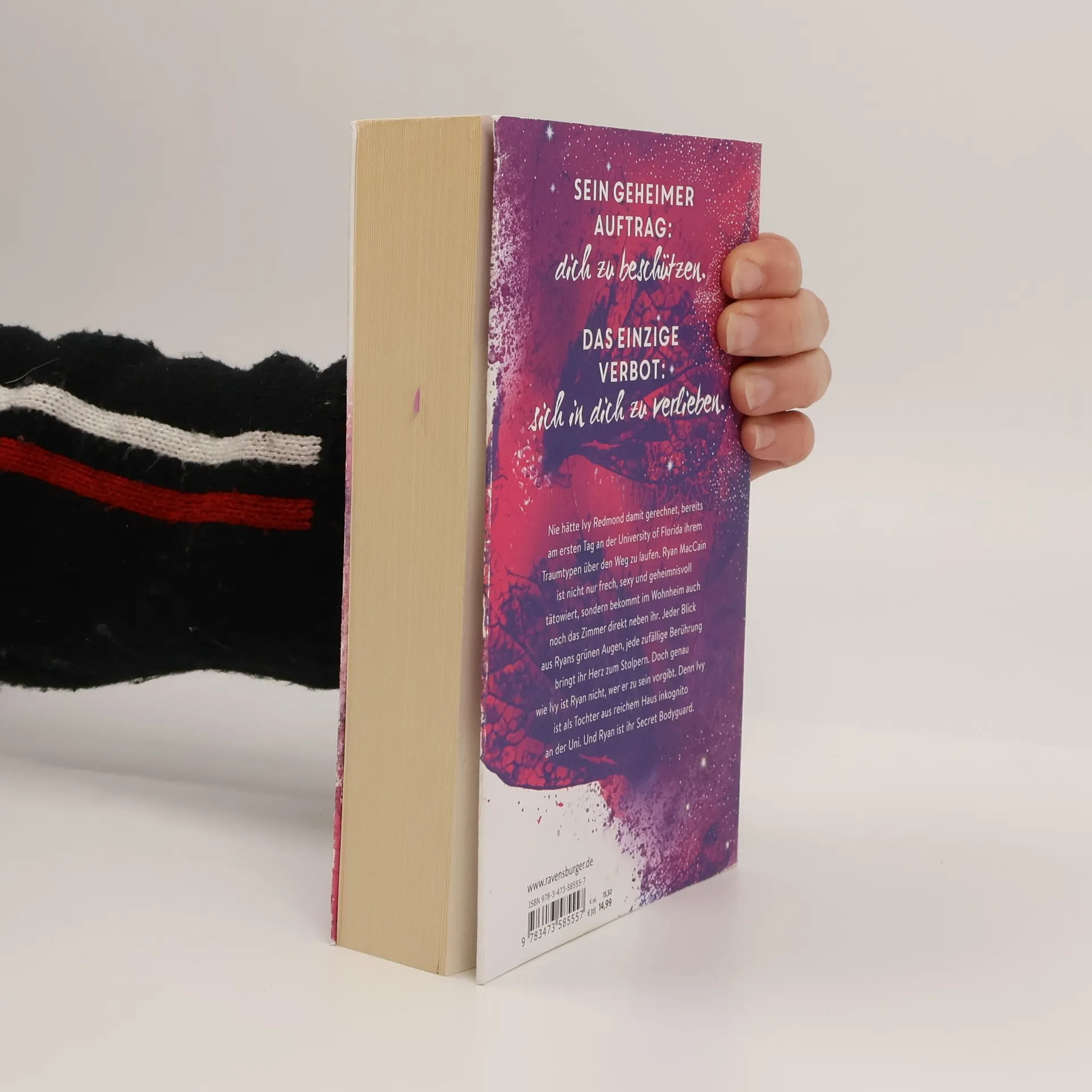Charmant. Unverschämt sexy. Prickelnd. Bodyguard-Romance at its best. Sein geheimer Auftrag: Dich zu beschützen. Das einzige Verbot: Sich in dich zu verlieben. Ivy Redmond trifft am ersten Tag an der University of Central Florida auf ihren Traumtypen, Ryan MacCain. Er ist nicht nur frech und sexy, sondern auch geheimnisvoll tätowiert und wohnt direkt neben ihr im Wohnheim. Jeder Blick aus seinen grünen Augen und jede zufällige Berührung lässt ihr Herz schneller schlagen. Doch sowohl Ivy als auch Ryan haben Geheimnisse. Ivy ist inkognito an der Uni, da sie aus reichem Haus stammt, und Ryan ist ihr Secret Bodyguard. In einer knisternden Szene wird die Spannung zwischen den beiden deutlich. Ivy spürt Ryans sehnsüchtigen Blick, während sie sich mit der Zunge über die Lippen fährt. Trotz des Verbots, sich zu verlieben, kann Ryan nicht widerstehen. Er gesteht, dass die Wahrscheinlichkeit hoch ist, dass er nicht mehr von ihr lassen kann, wenn er einmal anfängt. Ivy, verführt von der Nähe und der Anziehung, bittet ihn schließlich, sie zu küssen – nur noch einmal. Die Situation wird brenzlig, besonders wenn Ivys Vater auftaucht.