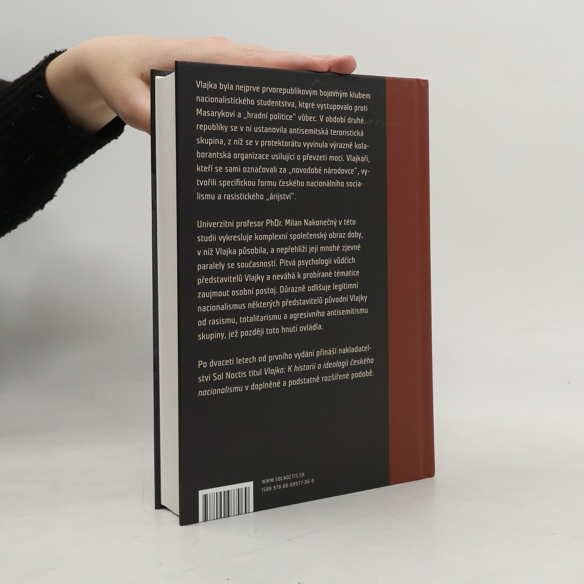 Vlajka byla nejprve prvorepublikovým bojovným klubem nacionalistického studentstva, které vystupovalo proti Masarykovi a „hradní politice“ vůbec. V období druhé republiky se v ní ustanovila antisemitská teroristická skupina, z níž se v protektorátu vyvinula výrazně kolaborantská organizace usilující o převzetí moci. Vlajkaři, kteří se sami označovali za „novodobé národovce“, vytvořili specifickou formu českého nacionálního socialismu a rasistického „árijství“. Univerzitní profesor PhDr. Milan Nakonečný v této studii vykresluje komplexní společenský obraz doby, v níž Vlajka působila, a nepřehlíží její mnohé zjevné paralely se současností. Pitvá psychologii vůdčích představitelů Vlajky a neváhá k probírané tématice zaujmout osobní postoj. Důrazně odlišuje legitimní nacionalismus některých představitelů původní Vlajky od rasismu, totalitarismu a agresivního antisemitismu skupiny, jež později toto hnutí ovládla. Po dvaceti letech od prvního vydání přináší nakladatelství Sol Noctis titul Vlajka: K historii a ideologii českého nacionalismu v doplněné a podstatně rozšířené podobě.