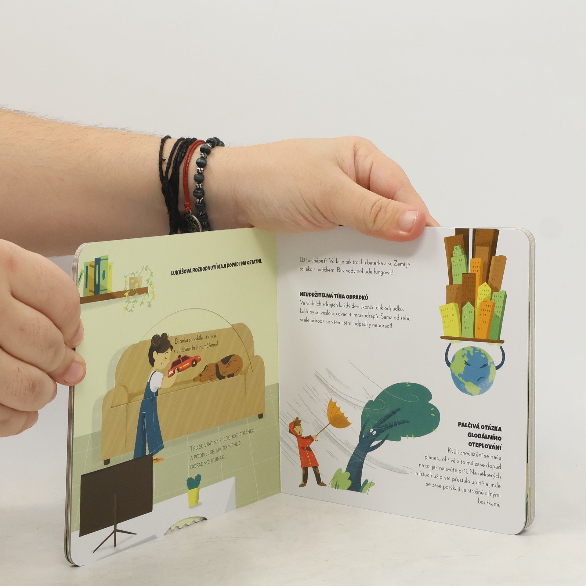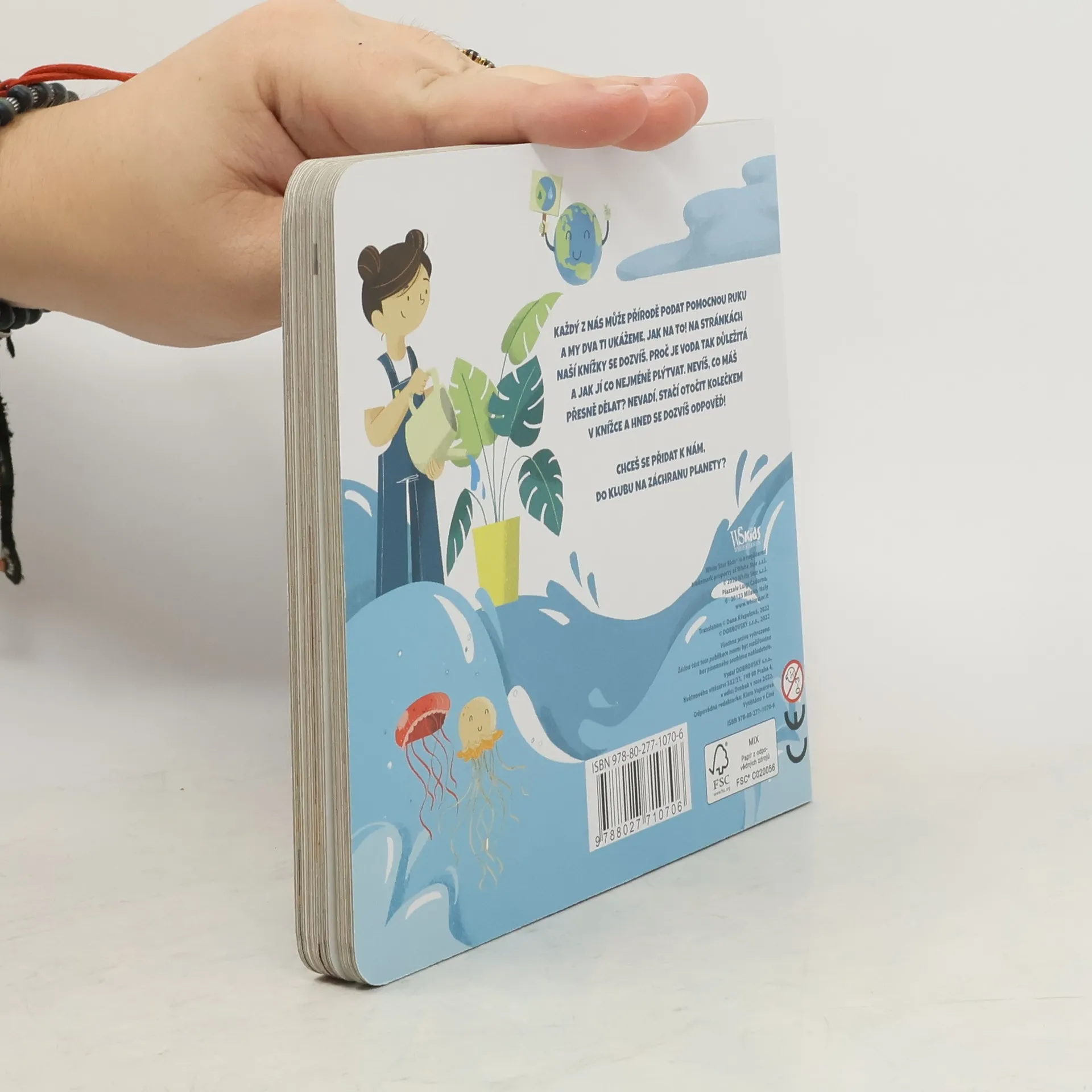 Všichni můžeme přírodě podat pomocnou ruku a my vám ukážeme, jak na to! Na stránkách naší knížky se dozvíte, proč je voda tak důležitá a jak s ní co nejméně plýtvat. Nejste si jisti, co máte dělat? Stačí otočit kolečkem v knížce a odpovědi se objeví! Tato řada leporel pomůže dětem se rozhodovat správně v situacích, kdy jde o záchranu planety! Po krátkém úvodu najdou děti na každé stránce otočné kolečko. Pokud jím otočí tak, že výsledkem bude ekologické řešení, následující stránka bude zobrazovat šťastný konec. Pokud se ale rozhodnou neekologicky, v životním prostředí se stane něco špatného… ale z této zkušenosti se mohou poučit a znovu se nad svým chováním zamyslet! Je to jednoduchý, ale účinný nápad, jak dětem ukázat, že jejich chování ovlivňuje celou planetu. Mohou se z toho poučit a odnést si cenné lekce do života.
