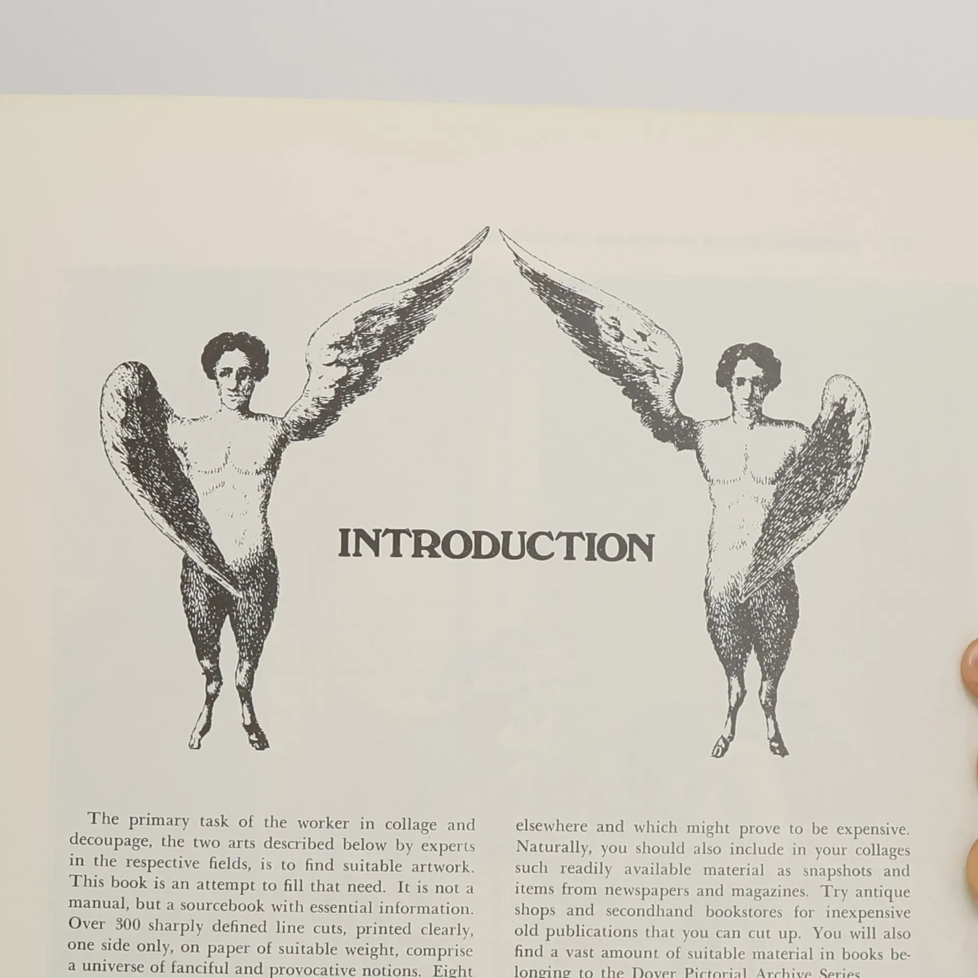 317 strange cuts (mostly 19th century), 45 color illustrations, 25 full-page scenic backgrounds—all printed on one side of a page for easy use. Birds, odd buildings, horses, early scientific equipment, strange inventions, dolls, monsters, baboons, statues, trunks, electric chair, crocodiles, dancers, idols—much else. Instructions for decoupage, collage.