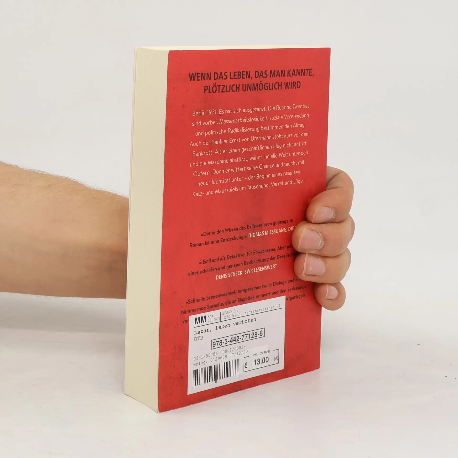 »›Emil und die Detektive‹ für Erwachsene. Aber mit einer scharfen und genauen Beobachtung der Gesellschaft.« Denis Scheck, SWR lesenswert Berlin 1931. Es hat sich ausgetanzt. Die Roaring Twenties sind vorbei. Massenarbeitslosigkeit, soziale Verelendung und politische Radikalisierung bestimmen den Alltag. Nach dem Börsenkrach von 1929 steht auch der angesehene Bankier Ernst von Ufermann kurz vor dem Bankrott. Er muss dringend nach Frankfurt, um einen neuen Kredit zu verhandeln. Auf dem Weg zum Flughafen werden ihm seine Papiere gestohlen, das Flugzeug startet ohne ihn. Als es kurz danach abstürzt, glaubt alle Welt, dass auch er unter den Opfern ist. Ufermann packt die Gelegenheit beim Schopf: Im Dienst eines jungen nationalsozialistischen Zirkels nimmt er eine neue Identität an, fährt nach Wien und taucht dort unter neuem Namen unter. Seine Ehefrau, die schon lange eine Affäre mit Ufermanns Kompagnon unterhält, streicht derweil die exorbitante Lebensversicherungssumme ihres Mannes ein - und ein rasantes Katz- und Mausspiel um Täuschung, Verrat und Lüge beginnt.