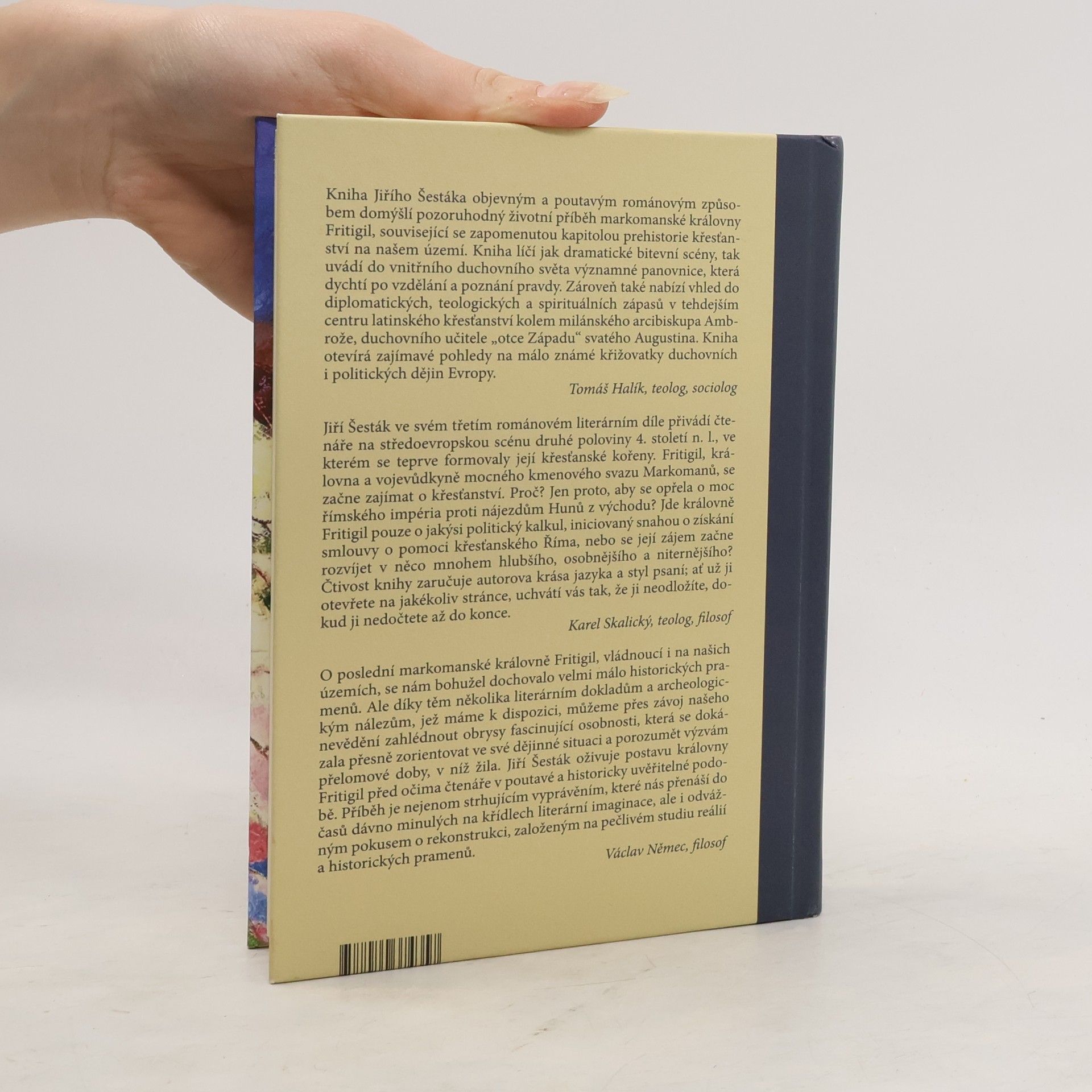 Kniha Jiřího Šestáka objevným a poutavým románovým způsobem domýšlí pozoruhodný životní příběh markomanské královny Fritigil, související se zapomenutou kapitolou prehistorie křesťanství na našem území. O této poslední markomanské královně, vládnoucí i na našich územích, se nám bohužel dochovalo velmi málo historických pramenů. Ale díky těm několika literárním dokladům a archeologickým nálezům, jež máme k dispozici, můžeme přes závoj našeho nevědění zahlédnout obrysy fascinující osobnosti, která se dokázala přesně zorientovat ve své dějinné situaci a porozumět výzvám přelomové doby, v níž žila. Jiří Šesták oživuje postavu královny Fritigil před očima čtenáře v poutavé a historicky uvěřitelné podobě. Příběh je nejenom strhujícím vyprávěním, které nás přenáší do časů dávno minulých na křídlech literární imaginace, ale i odvážným pokusem o rekonstrukci, založeným na pečlivém studiu reálií a historických pramenů.