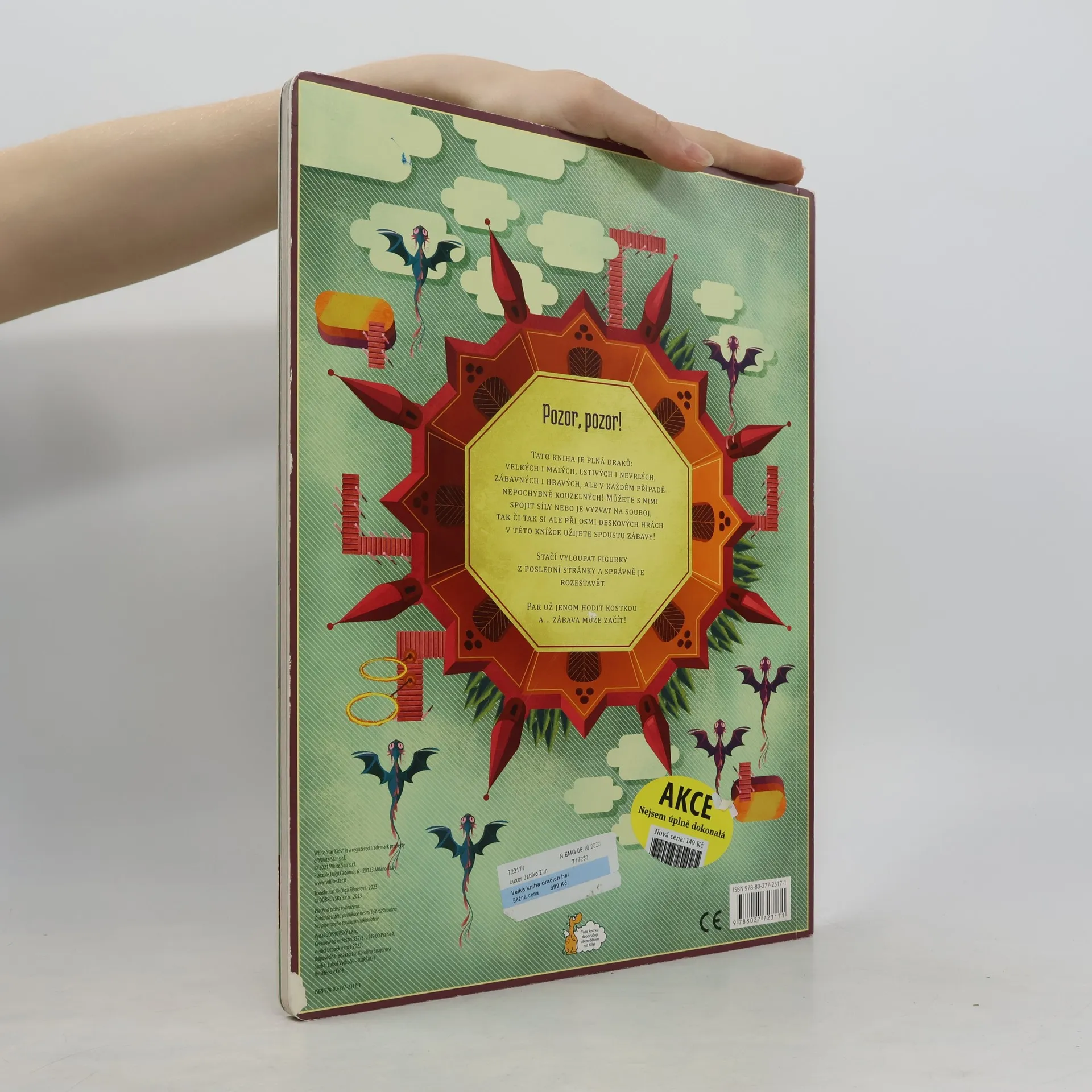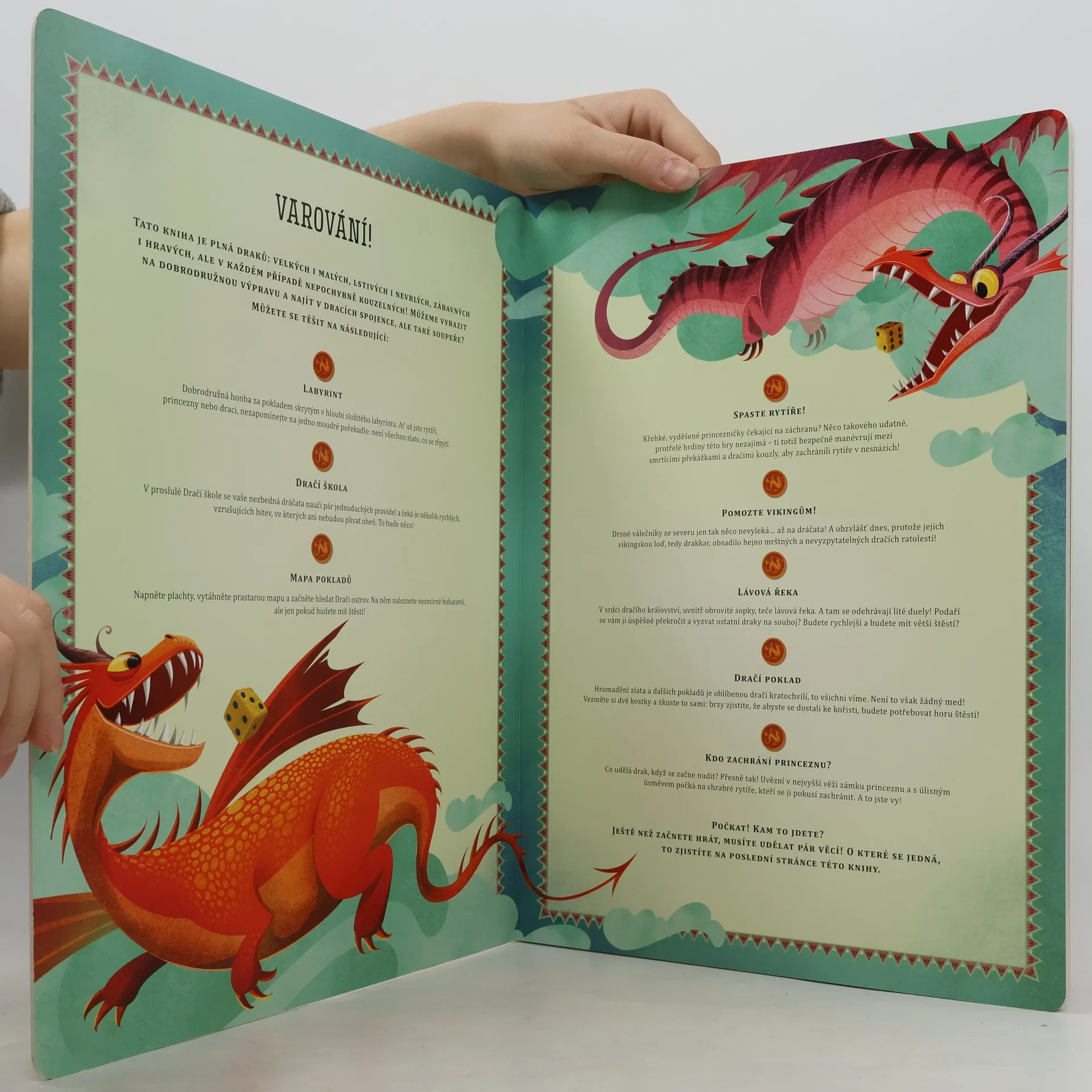 Ztraťte se v epické krajině této zábavné knihy her, ve které draci doslova ožívají! Tato kniha je plná draků: velkých i malých, lstivých i nevrlých, zábavných i hravých, ale v každém případě nepochybně kouzelných! Jste připraveni vyrazit na dobrodružnou výpravu? Spojit se s nimi, ale také proti nim bojovat? Jakmile jednoduše sestavíte figurky v této knize, vezměte kostku a přizvěte své přátele k zábavné hře. Prověřte své dovednosti ve hrách, jako je Labyrint, Spaste rytíře nebo Lávová řeka. Celkem jich na vás čeká osm.