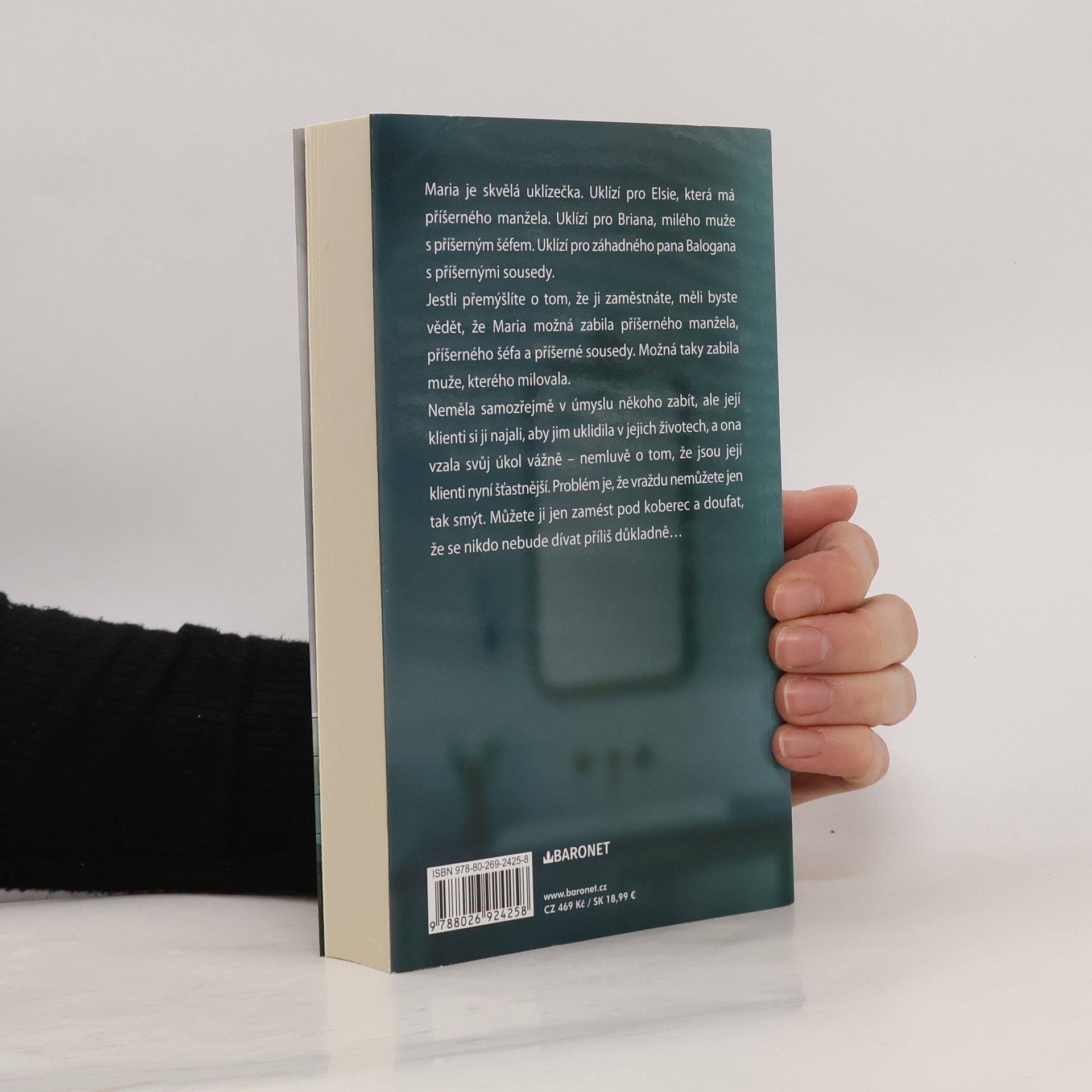 Zanechá vaše povrchy zářivě lesklé. Ale může vás také nechat mrtvé... Maria je skvělá uklízečka. Uklízí pro Elsie, která má příšerného manžela. Uklízí pro Briana, milého muže s příšerným šéfem. Uklízí pro záhadného pana Balogana s příšernými sousedy. Jestli přemýšlíte o tom, že ji zaměstnáte, měli byste vědět, že Maria možná zabila příšerného manžela, příšerného šéfa a příšerné sousedy. Možná taky zabila muže, kterého milovala. Neměla samozřejmě v úmyslu někoho zabít, ale její klienti si ji najali, aby jim uklidila v jejich životech, a ona vzala svůj úkol vážně – nemluvě o tom, že jsou její klienti nyní šťastnější. Problém je, že vraždu nemůžete jen tak smýt. Můžete ji jen zamést pod koberec a doufat, že se nikdo nebude dívat příliš důkladně…