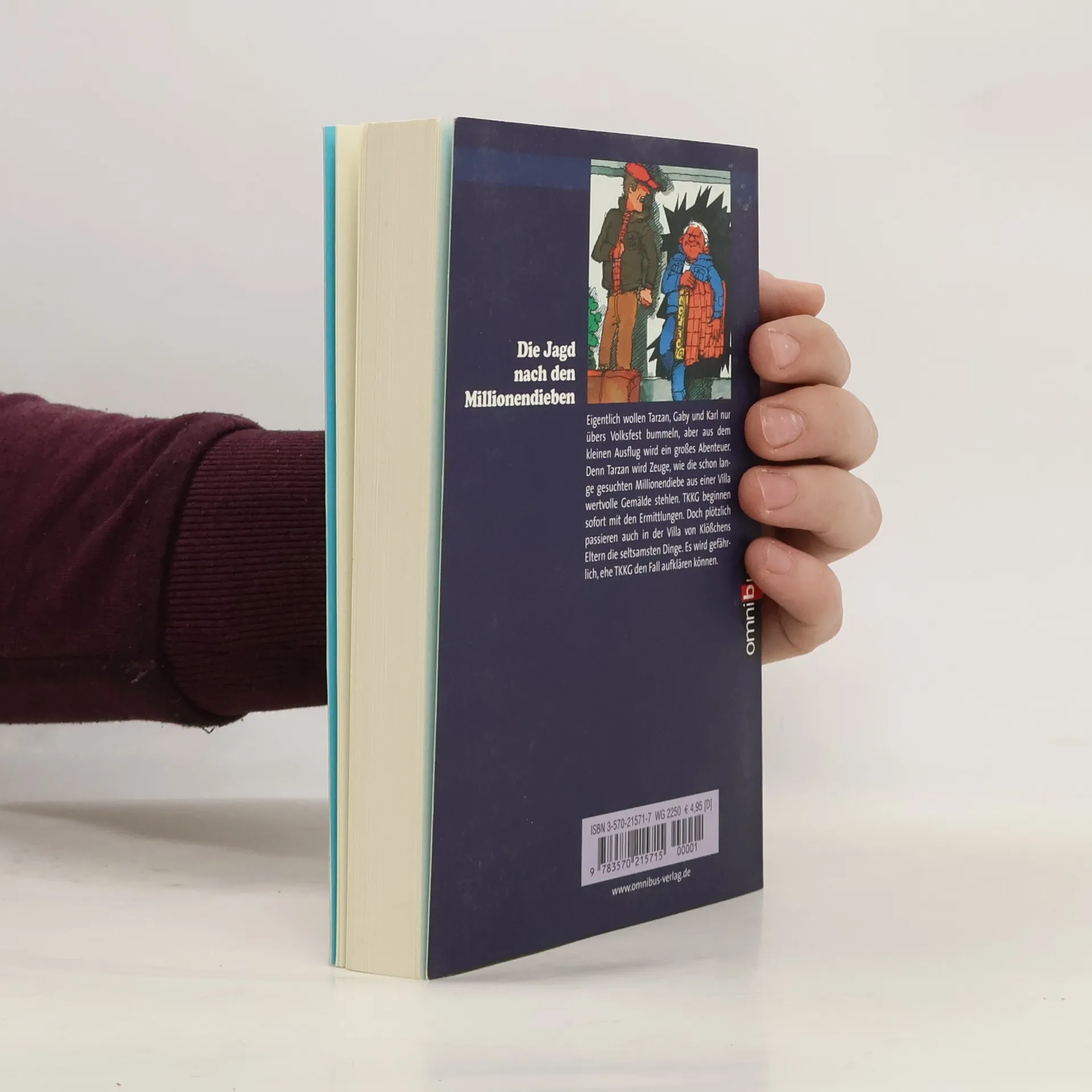 Eigentlich wollen Tarzan, Gaby und Karl nur mal abends übers Volksfest bummeln, aber aus dem kleinen Ausflug wird ein großes Abenteuer. Zufällig beobachtet Tarzan, wie die schon lange gesuchten Millionendiebe aus einer Villa wertvolle Gemälde stehlen. Unsere vier Freunde vom TKKG, denn natürlich gehört auch Klößchen dazu, wollen die Bande ganz allein entlarven. Welche Rolle spielt der seltsame Bruder des unsympathischen Zeichenlehrers Pauling? Haben die Rocker etwas mit den Einbrüchen zu tun? Was tut sich in der feudalen Villa von Klößchens Eltern, wo der Chauffeur niedergeschlagen wird und das Luxusauto verschwindet? Lauter merkwürdige Dinge geschehen, die sich nicht zusammenreimen. Nichts kann unsere vier Freunde von der waghalsigen Gangsterjagd abhalten, die mit einer handfesten Überraschung endet.