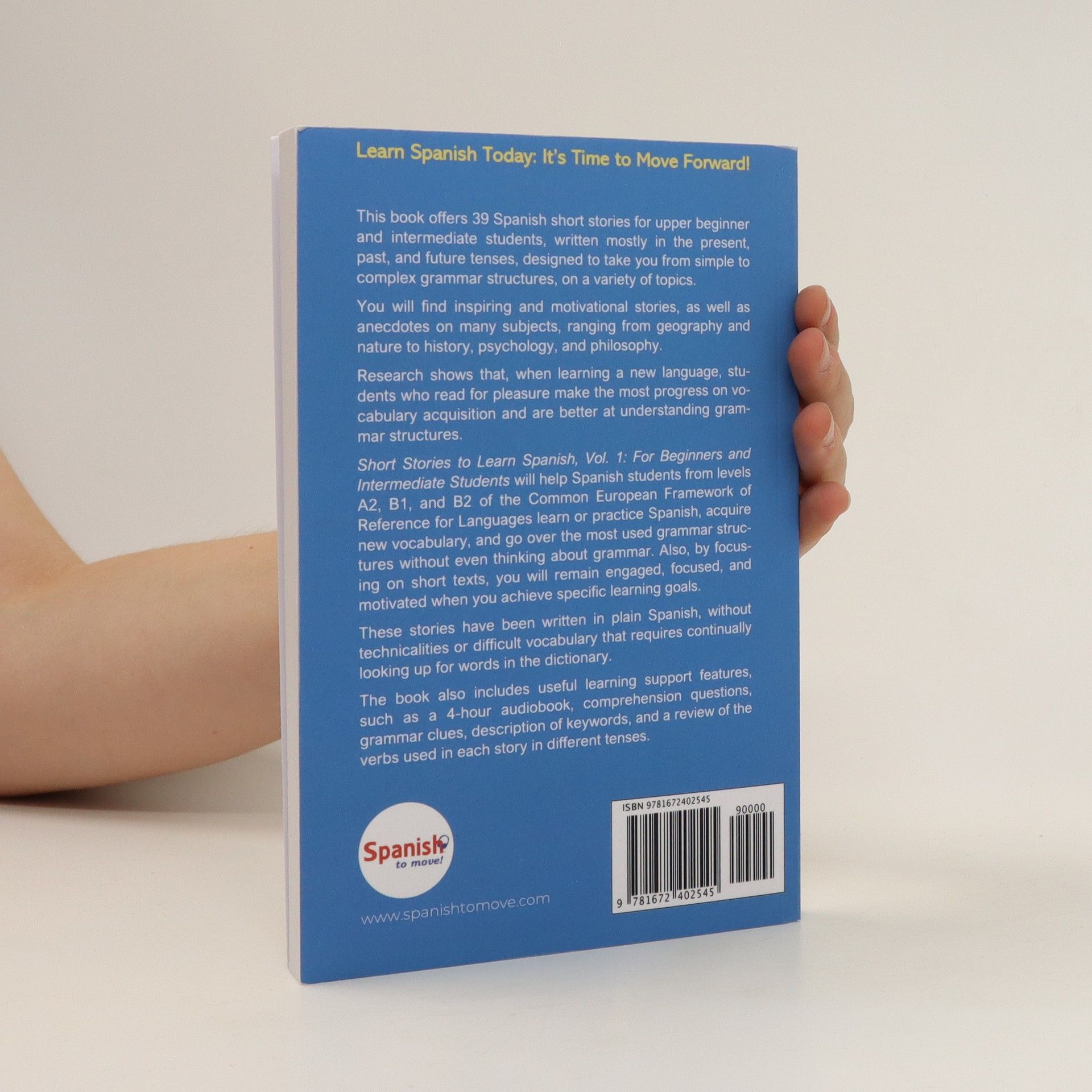 Research shows that, when learning a new language, students who read for pleasure make the most progress on vocabulary acquisition and are better at understanding grammar structures. After several years of delivering audio and video lessons online, Spanish To Move(R) is publishing this book, which follows its unique formula: interesting stories carefully prepared to create subconscious patterns in the students. In this context, these stories will help you learn or practice Spanish, acquire new vocabulary, and go over the most used grammar structures without even thinking about grammar. Also, by focusing on short texts, you will remain engaged, focused and motivated when you achieve specific learning goals. This book offers 39 stories designed to take you from simple to complex grammar structures, on a variety of topics. You will find inspiring and motivational stories, as well as anecdotes on many subjects, ranging from geography and nature to history, psychology, and philosophy. The stories have been written mostly in present, past and future tenses, for beginner and intermediate students (levels A2, B1, and B2 of the Common European Framework of Reference for Languages).