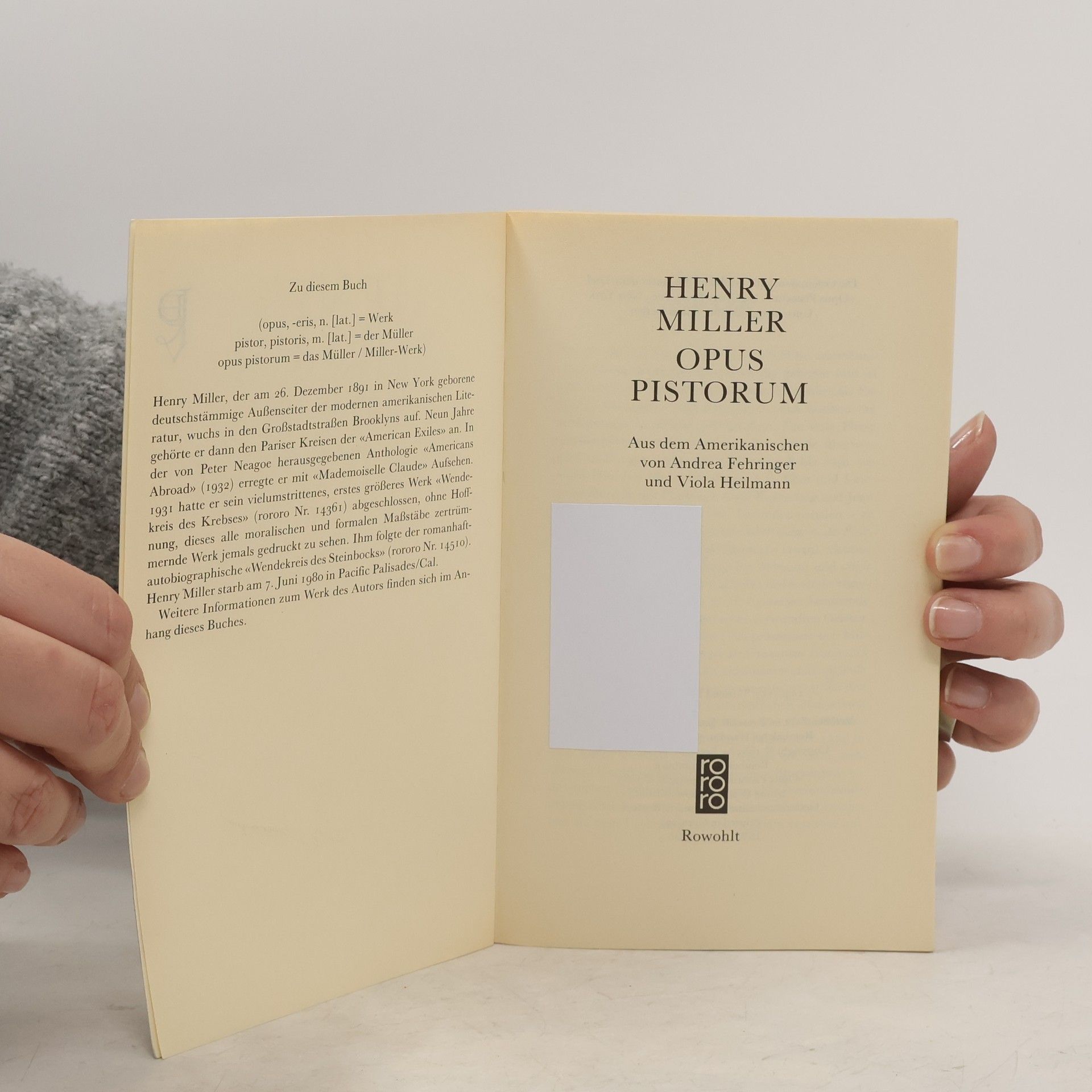 „Henry, der Geld brauchte, schlug mir vor, er werde für mich verkäufliche Texte schreiben. Ich bot ihm ein Honorar von einem Dollar pro Seite, dafür erhielt ich alle Rechte ... Ich bezahlte immer bar, wie ausgemacht. Nach wenigen Monaten ergaben die angesammelten Seiten ein komplettes Buch, dem er den Titel OPUS PISTORUM gab“ (Milton Luboviski, Buchhändler in Hollywood, 1983 in einer eidesstattlichen Erklärung).Diese spät entdeckten Erotica des großen Autors sind für Kenner - und nicht nur für diese - eine literarische Sensation.