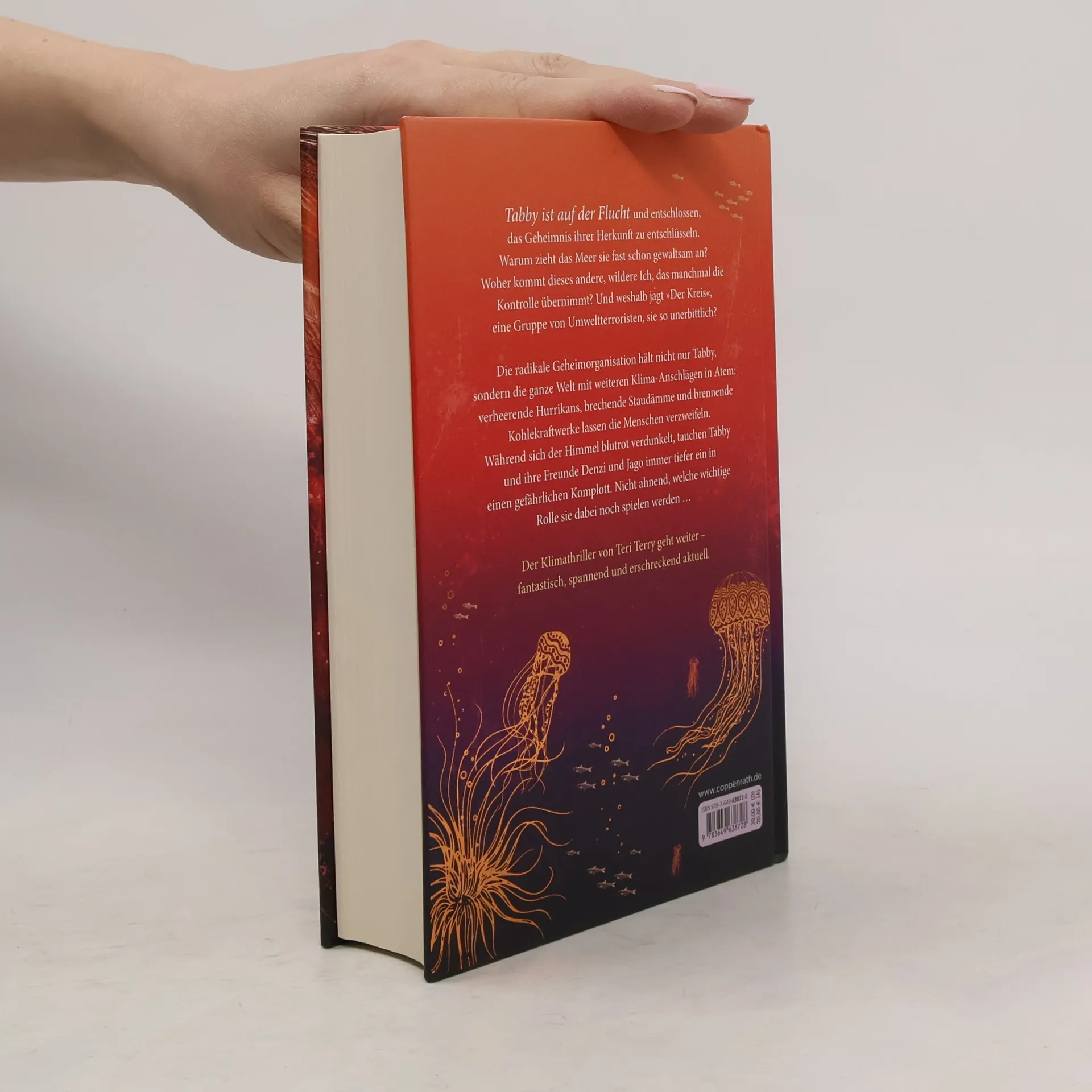 Tabby ist auf der Flucht und entschlossen, das Geheimnis ihrer Herkunft zu entschlüsseln. Warum zieht das Meer sie fast schon gewaltsam an? Woher kommt dieses andere, wildere Ich, das manchmal die Kontrolle übernimmt? Und weshalb jagt “Der Kreis”, eine Gruppe von Umweltterroristen, sie so unerbittlich? Die radikale Geheimorganisation hält nicht nur Tabby, sondern die ganze Welt mit weiteren Klima-Anschlägen in Atem: verheerende Hurrikans, brechende Staudämme und brennende Kohlekraftwerke lassen die Menschen verzweifeln. Während sich der Himmel blutrot verdunkelt, tauchen Tabby und ihre Freunde Denzi und Jago immer tiefer ein in einen gefährlichen Komplott. Nicht ahnend, welche wichtige Rolle sie dabei noch spielen werden …