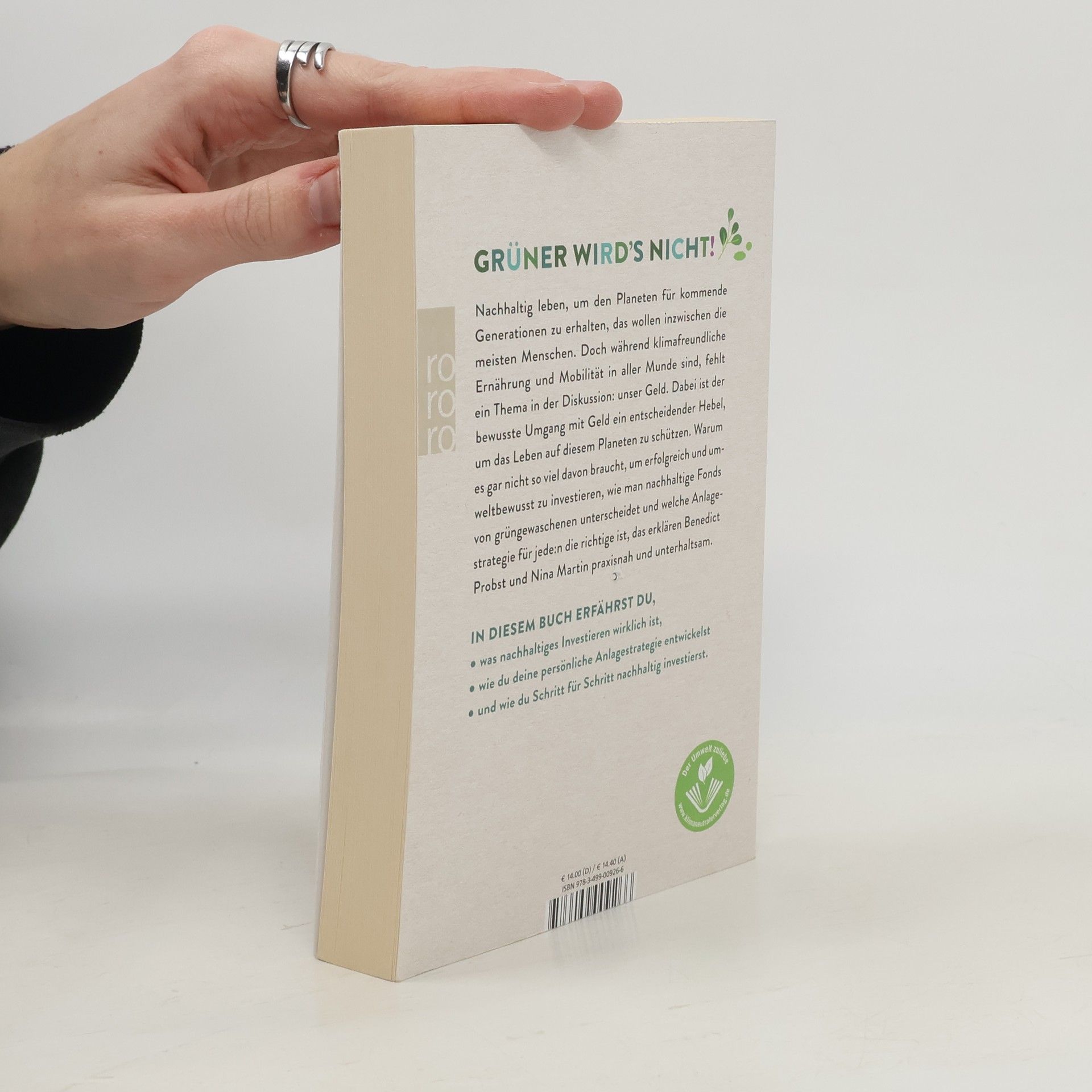 Grüner wird′s nicht! Nachhaltig leben, um den Planeten für kommende Generationen zu erhalten, das wollen inzwischen die meisten Menschen. Doch während klimafreundliche Ernährung und Mobilität in aller Munde sind, fehlt ein Thema in der Diskussion: unser Geld. Dabei ist der bewusste Umgang mit Geld ein entscheidender Hebel, um das Leben auf diesem Planeten zu schützen. Warum es gar nicht so viel davon braucht, um erfolgreich und umweltbewusst zu investieren, wie man nachhaltige Fonds von grüngewaschenen unterscheidet und welche Anlagestrategie für jede: n die richtige ist, das erklären Benedict Probst und Nina Martin praxisnah und unterhaltsam. In diesem Buch erfährst du,• was nachhaltiges Investieren wirklich ist,• wie du deine persönliche Anlagestrategie entwickelst• und wie du Schritt für Schritt nachhaltig investierst.