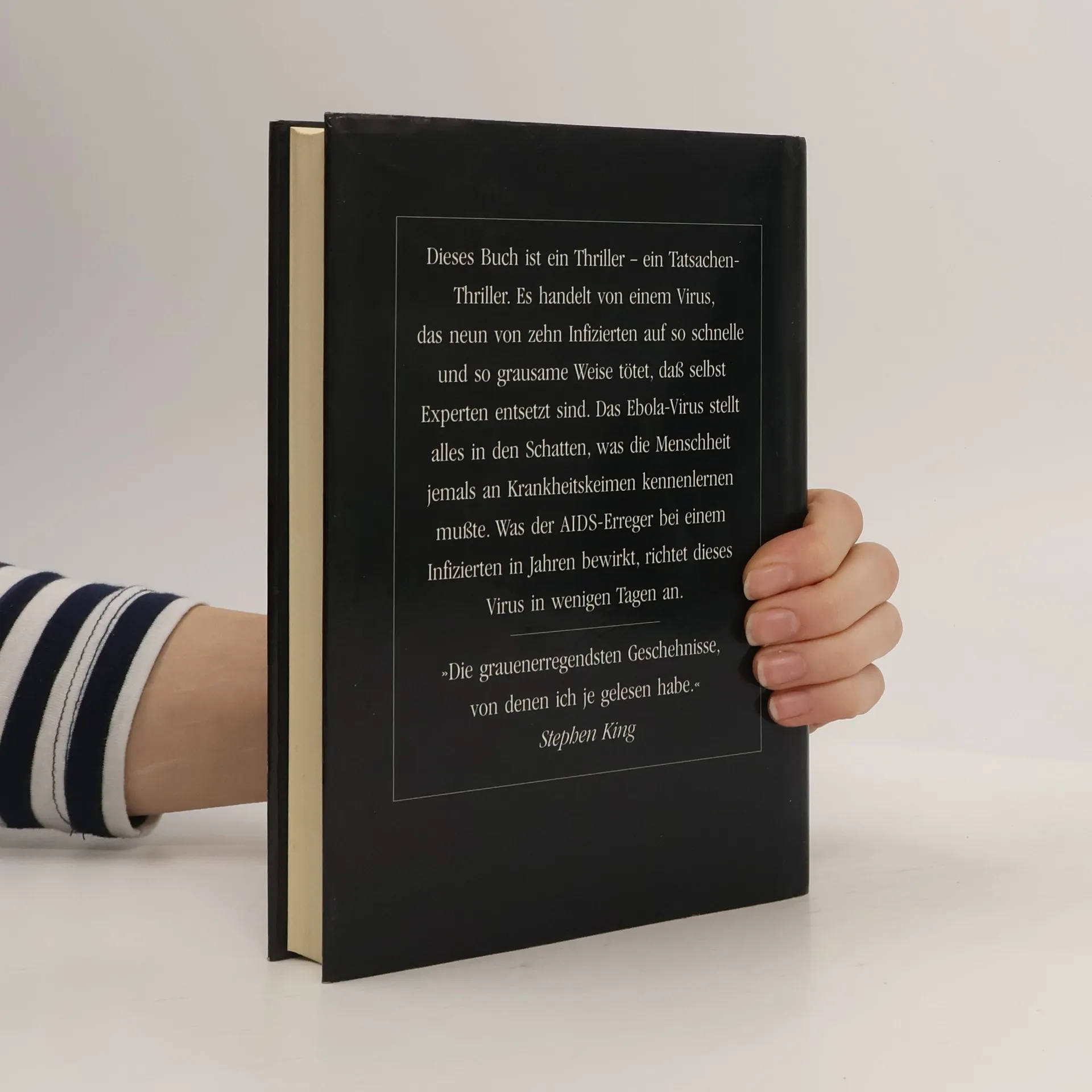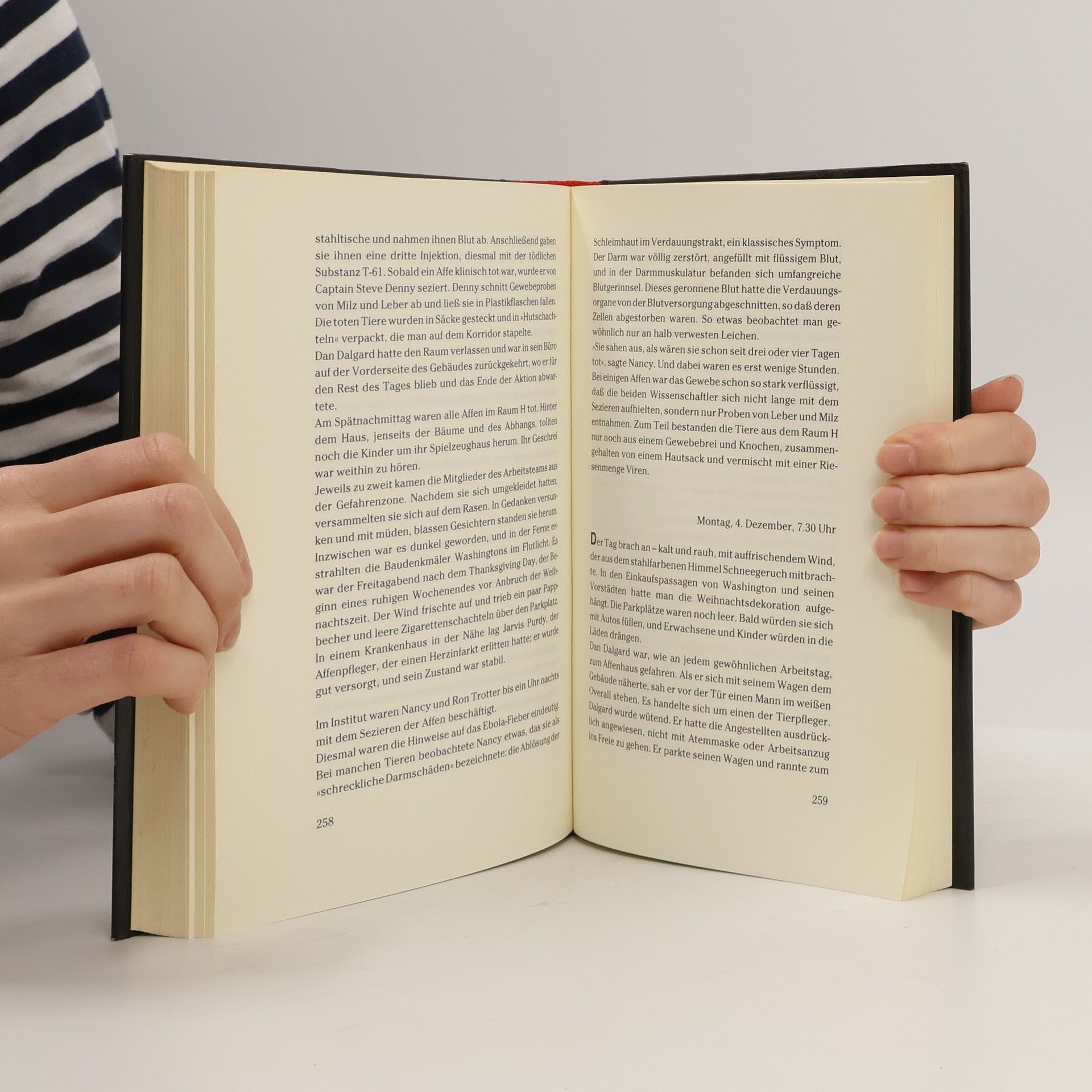 Richard Prestons populärwissenschaftlicher Tatsachen-Thriller liest sich spannender als jeder Horror-Roman. Preston berichtet darin über die ersten Infektionen mit dem Ebola-Virus vor über vierzig Jahren. Sein Tatsachenthriller von 1998 ist immer noch hochaktuell, wie die schreckliche Ebola-Epidemie in Zentralafrika gerade zeigt. Ebola gehört zu den gefährlichsten Killerviren. Diese aus dem Afrikanischen Regenwald stammenden sogenannten „Filoviren“, können einen Menschen auf grausamste Art und Weise töten. Das Virus löst innerhalb weniger Tage die inneren Organe auf, und der Erkrankte verblutet von innen. Das Virus ist zudem extrem ansteckend, und weltweit gibt es immer noch kein wirksames Heilmittel dagegen. Deshalb ist es nicht auszuschließen, dass die Menschheit eines Tages einer Seuche wie Ebola erliegen könnte. Preston schildert, wie der Ebola-Erreger über Affen, die für medizinische Versuche importiert wurden, schließlich nach Amerika kommt. In einem kleinen Labor in Reston, USA, verbreitet er Angst und Schrecken. Als sich die Seuche unter den im Quarantänelager zusammengepferchten Affen ausbreitet, rufen die Betreiber der Anlage die Gesundheitsbehörden zu Hilfe. Bald müssen die Wissenschaftler feststellen, dass sich das Virus inzwischen nicht nur durch Kontakt, sondern auch durch die Luft verbreiten kann.