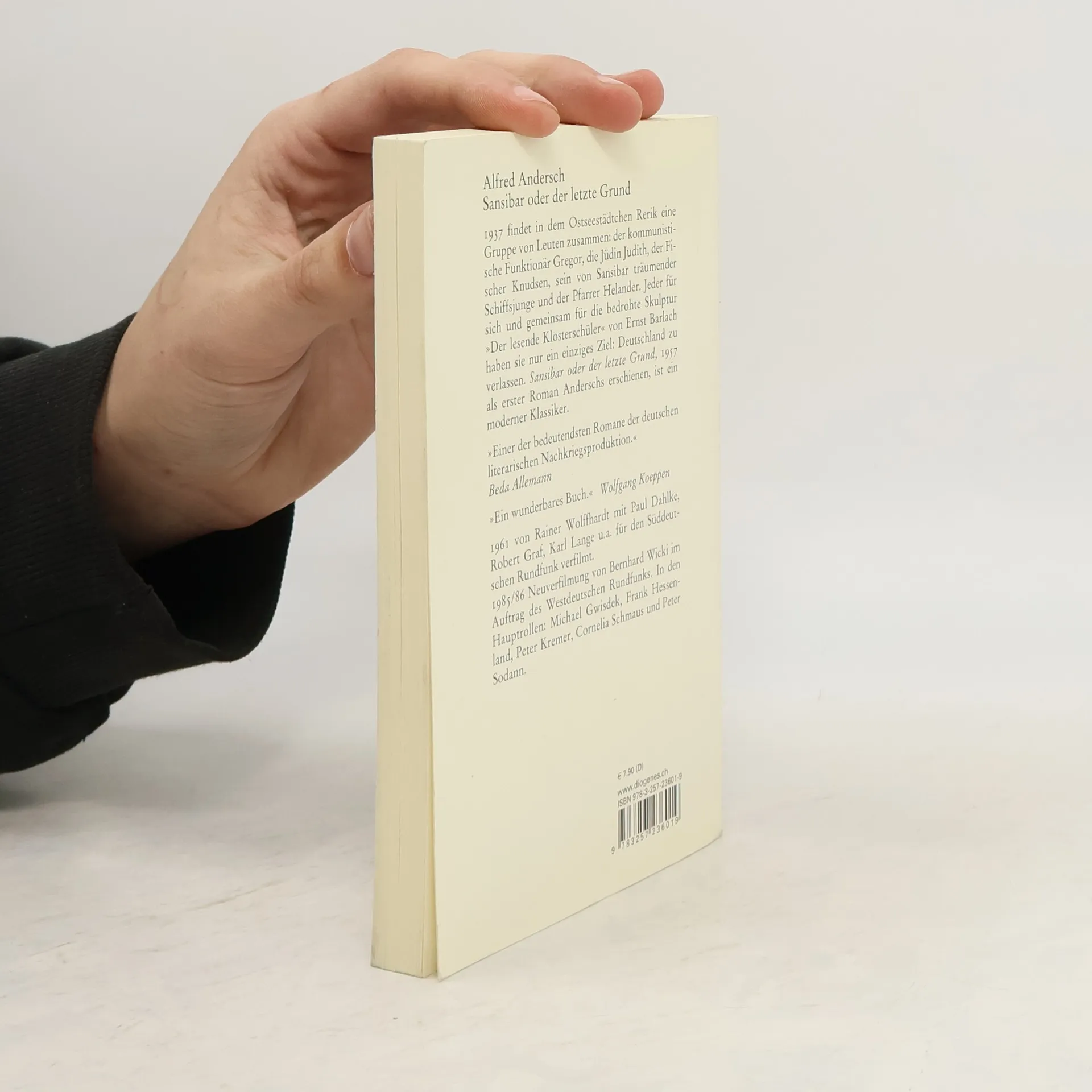 »In einer kleinen Stadt an der Ostsee treffen zufällig sechs Gestalten zusammen: Der Junge; Gregor, der KPD-Funktionär; Judith, die Jüdin; am Ort selbst befinden sich der Pfarrer Helander; Knudsen, der Fischer und Kutterbesitzer; als letzter die Holzplastik des Lesenden Klosterschülers. Und diese sechs Gestalten haben kein anderes Anliegen, als Deutschland zu verlassen... Alfred Anderschs großes Buch von Sansibar ist ein Mißtrauensvotum ersten Ranges gegen unser behäbig aufgeblasenes Volk der Mitte.«