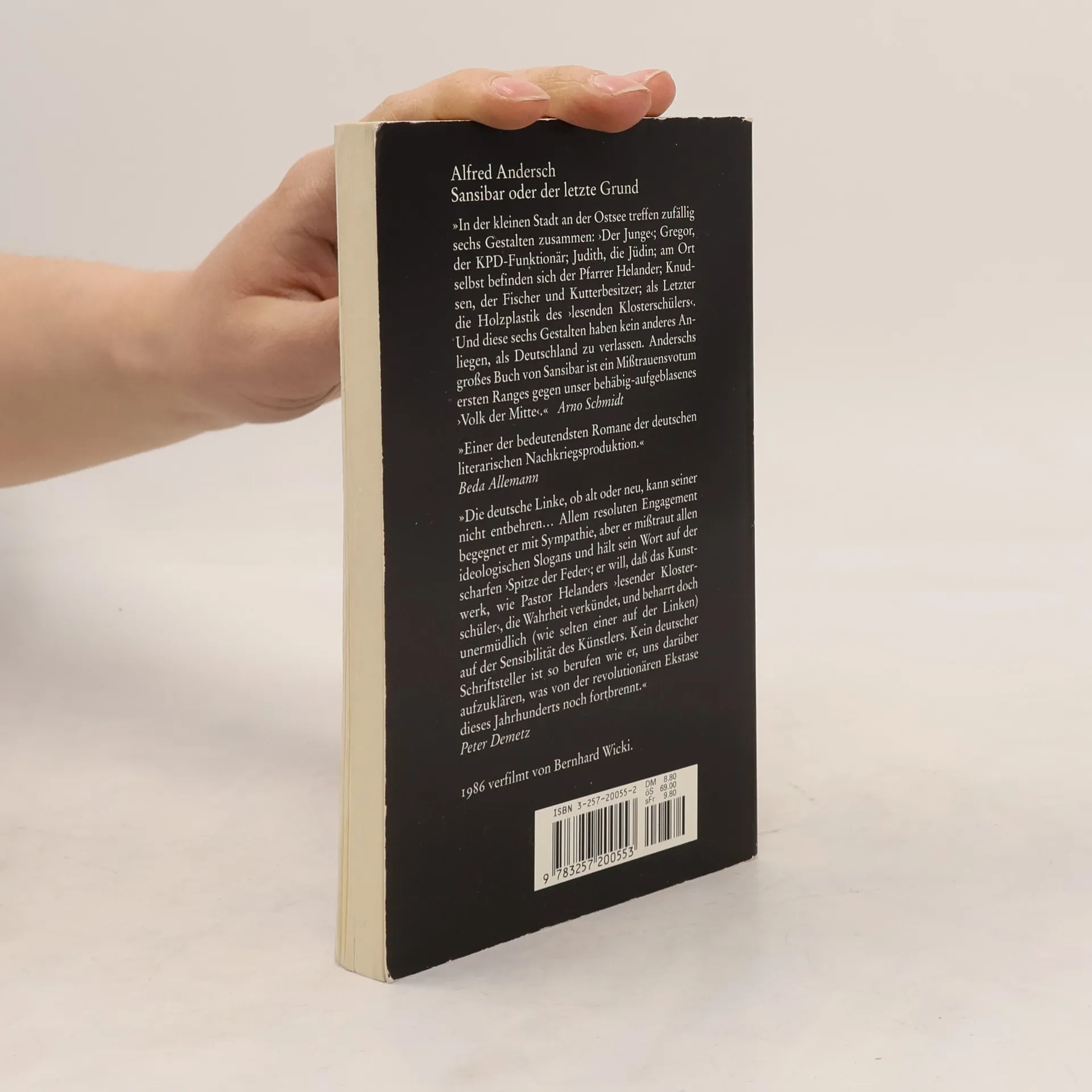 In einer kleinen Stadt an der Ostsee treffen zufällig sechs Gestalten zusammen: ›Der Junge‹; Gregor, der KPD-Funktionär; Judith, die Jüdin; am Ort selbst befinden sich der Pfarrer Helander; Knudsen, der Fischer und Kutterbesitzer; als letzter die Holzplastik des ›Lesenden Klosterschülers‹. Und diese sechs Gestalten haben kein anderes Anliegen, als Deutschland zu verlassen... Alfred Anderschs großes Buch von Sansibar ist ein Mißtrauensvotum ersten Ranges gegen unser behäbig aufgeblasenes ›Volk der Mitte‹.