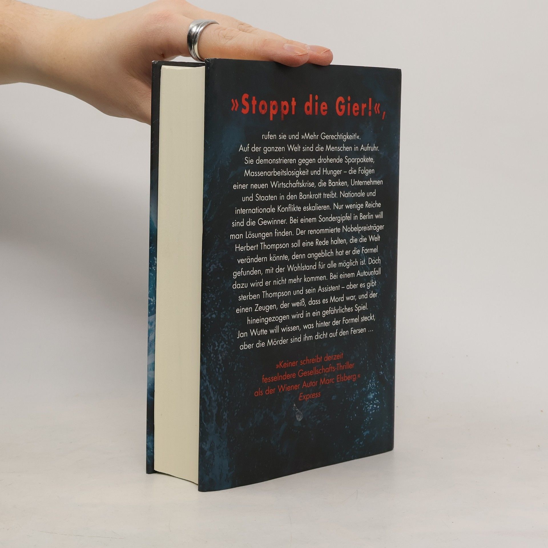 Höher, schneller, weiter ... Bis eine gewaltige Krise alles infrage stellt! Ein rasanter Thriller, der den Finger auf den wunden Punkt unserer Gesellschaft legt. Weltweit demonstrieren Menschen gegen drohende Sparpakete, Massenarbeitslosigkeit und Hunger – die Folgen einer neuen Wirtschaftskrise, die Banken, Unternehmen und Staaten in den Bankrott treibt. Nationale und internationale Konflikte eskalieren, während nur wenige Reiche profitieren. Bei einem Sondergipfel in Berlin soll der Nobelpreisträger Herbert Thompson eine bahnbrechende Rede halten, da er angeblich die Formel für Wohlstand für alle entdeckt hat. Doch ein Autounfall beendet sein Leben und das seines Assistenten. Ein Zeuge, der weiß, dass es Mord war, wird in ein gefährliches Spiel verwickelt. Jan Wutte ist entschlossen, das Geheimnis hinter der Formel zu lüften, doch die Mörder sind ihm dicht auf den Fersen. Eine rasante Flucht durch die Berliner Hausbesetzer-Szene und Nobelhotels hält den Leser über 448 Seiten in Atem. Die komplexe Wirtschaftstheorie hat der Autor in eine einfache Bauernfabel verpackt. Lesen Sie auch den aktuellen Thriller von Marc Elsberg: °C - Celsius! Ein Klimathriller, der alles auf den Kopf stellt. Weitere Titel sind BLACKOUT, ZERO und HELIX.