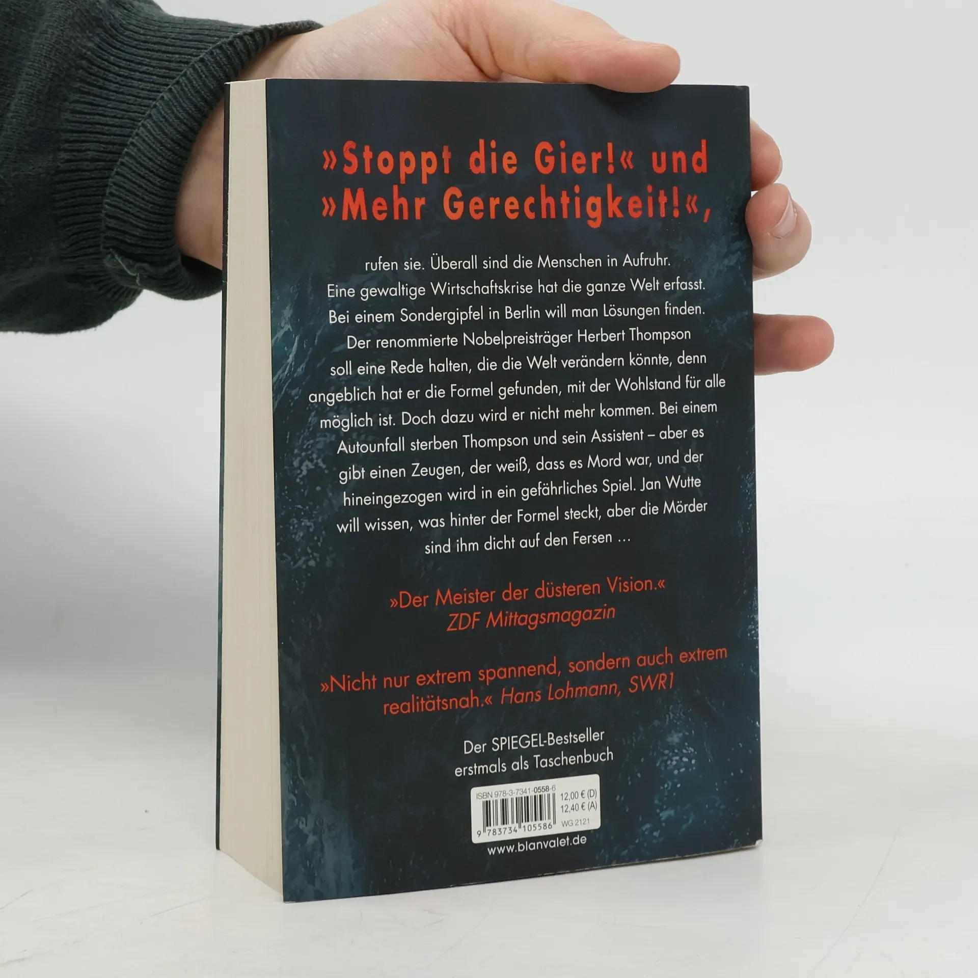 Höher, schneller, weiter ... Bis eine gewaltige Krise alles infrage stellt! Ein rasanter Thriller, der den Finger auf den wunden Punkt unserer Gesellschaft legt. Auf der ganzen Welt fordern die Menschen Gerechtigkeit und ein Ende der Gier. Bei einem Sondergipfel in Berlin soll Nobelpreisträger Herbert Thompson eine bahnbrechende Rede halten, die den Schlüssel zu Wohlstand für alle verspricht. Doch ein Autounfall beendet sein Leben und das seines Assistenten. Ein Zeuge weiß, dass es Mord war und wird in ein gefährliches Spiel verwickelt. Jan Wutte ist entschlossen, die Wahrheit hinter der Formel zu entdecken, während die Mörder ihm dicht auf den Fersen sind. Die Geschichte entfaltet sich in einer rasanten Flucht durch die Berliner Hausbesetzer-Szene und Nobelhotels, die den Leser über 448 Seiten fesselt. Die komplexe Wirtschaftstheorie des britischen Wissenschaftlers wird in eine einfache Bauernfabel verpackt, was die Spannung zusätzlich erhöht. Lesen Sie auch den aktuellen Thriller von Marc Elsberg: °C - Celsius! Ein Klimathriller, der alles auf den Kopf stellt. Außerdem erhältlich: BLACKOUT. Morgen ist es zu spät. Auch als Premiumausgabe – mit einer exklusiven Kurzgeschichte von Marc Elsberg und weiteren Extras! ZERO. Sie wissen, was du tust. HELIX: Sie werden uns ersetzen. Der Fall des Präsidenten.