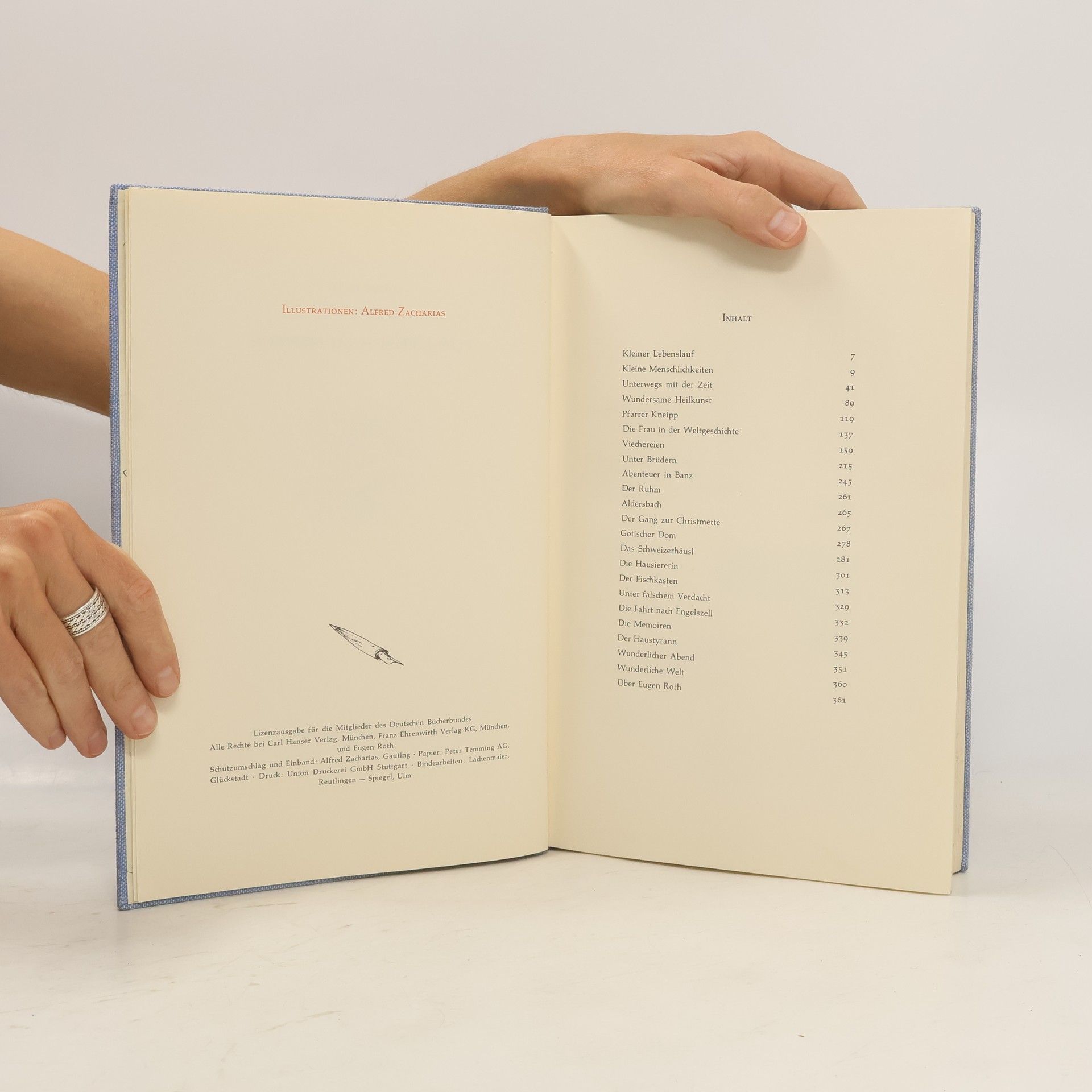 Dieses Werk enthält eine Reihe von erstmaligen Veröffentlichungen sowie eine Auswahl an Gedichten und Prosa aus bisher einzeln erschienenen Bänden. Ein Mensch Eugen Roths kleines Tierleben Mensch und Unmensch Sammelsurium Die Frau in der Weltgeschichte Unter Brüdern Heitere Kneipp-Fibel Der Weg übers Gebirg Der Wunderdoktor Abenteuer in Banz Gute Reise Das Schweizerhäusl Eugen Roths Tierleben Der Fischkasten