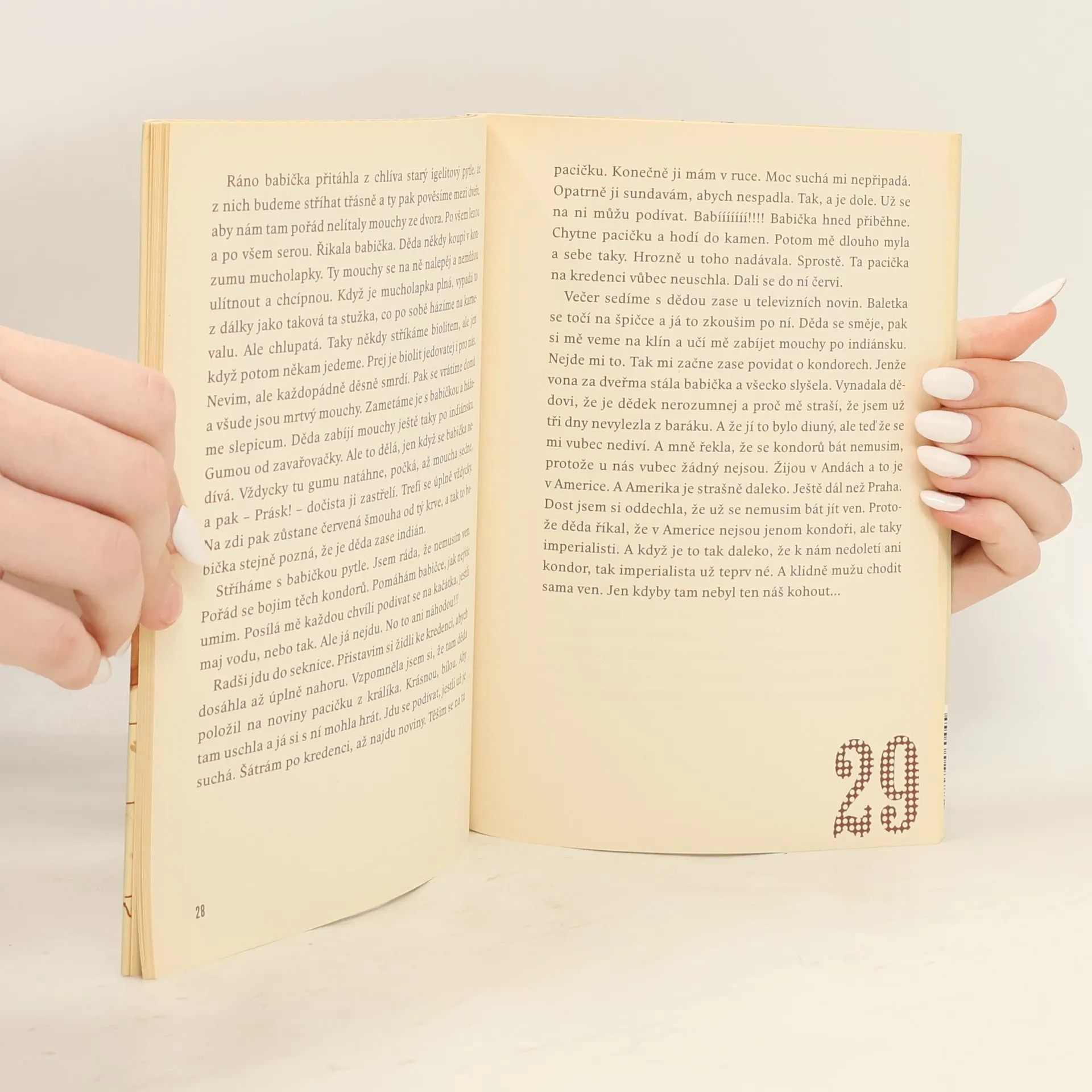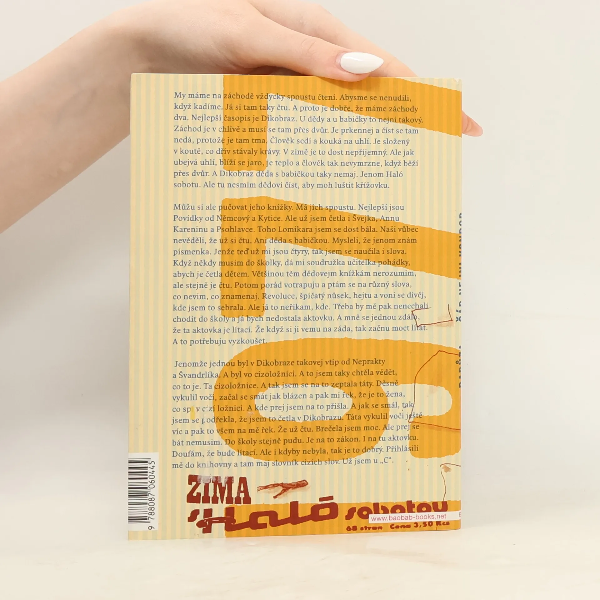 Třináct povídek o dětství svébytné písničkářky, muzikantky a textařky Radůzy. Přesvědčivě a s humorem načrtává Radůza realitu sklonku 70. let. Líčí dětství na venkově očima hubené svéhlavé holčičky, která už ve svých čtyřech letech má na život jasný názor, a jejím prostřednictvím vypráví historky rodinné i vesnické a vykresluje citlivý literární obraz svých prarodičů i rodinných peripetií. V povídkách s lapidárními názvy (Veranda, Kondor, Zavinovačka atd.) vykresluje babičku a dědu a především jejich venkovský způsob života - od všudypřítomného koloběhu: pouť, narozeniny, práce na dvoře, zabíjení králíků, nemoci psů, malé vesnické katastrofy, po nepodstatné detaily, které však dodávají textu naprosto hmatatelný rozměr a přenášejí nás do atmosféry vesnice, která dnes už v podstatě zanikla. Radůza vládne temperametním prozaickým talentem, který v tomto případě oživila i krajovým nářečím z východních Čech. A stejně jako ve svých písňových textech dokázala i zde vytvořit výborný koncentrát nabitý energií.