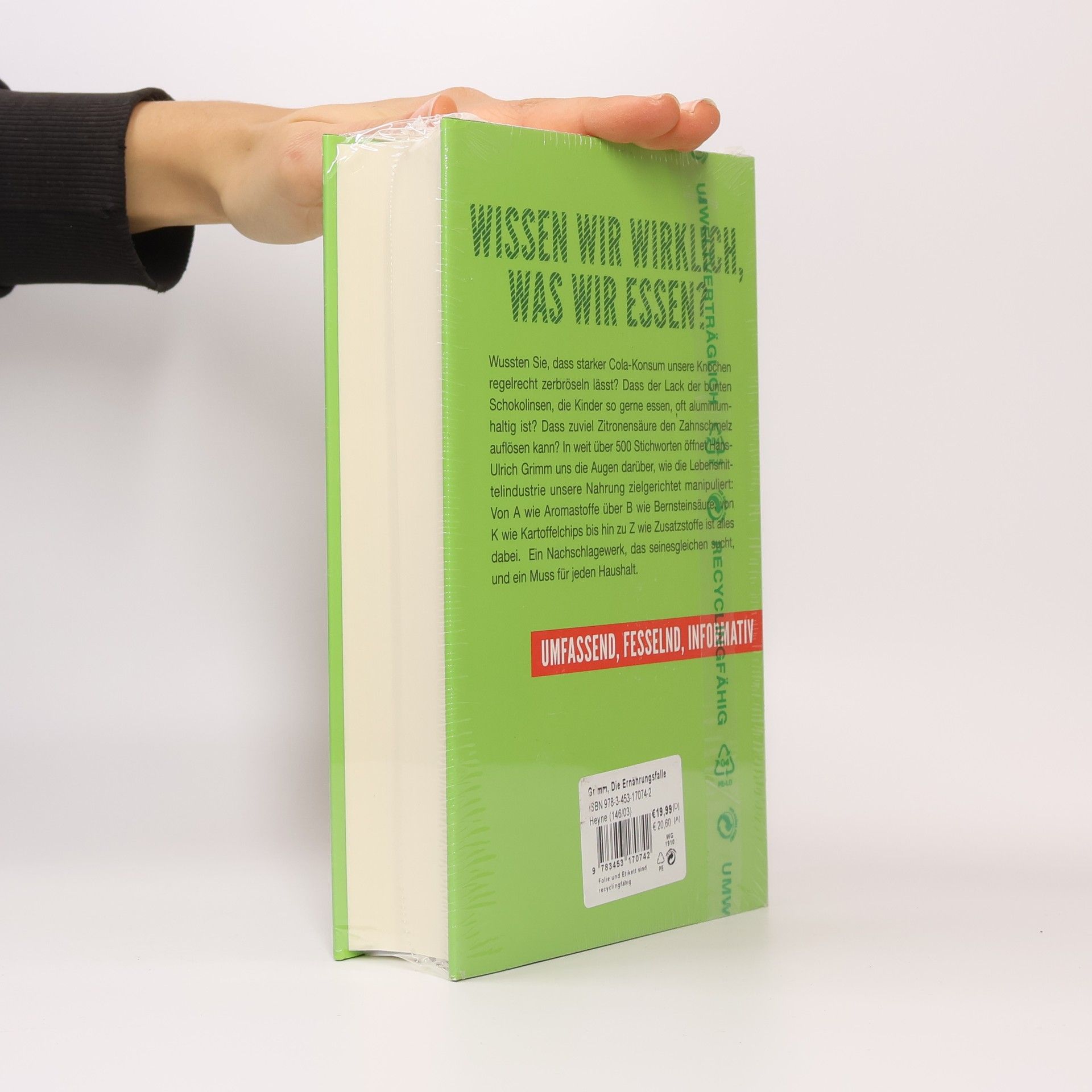 Sie nennen es Essen. Aluminiumhaltige Schokolinsen, Plastikhormone in Babynahrung, gefährliche Zitronensäure in Gummibärchen: Was steckt eigentlich im Essen drin, das wir Tag für Tag bedenkenlos zu uns nehmen? Der Nahrungskritiker und Bestsellerautor Hans-Ulrich Grimm geht den kleinen und großen Lügen der Lebensmittelindustrie radikal und schonungslos auf den Grund. Wussten Sie, dass Erdbeeraroma aus Sägespänen gewonnen wird? Dass der Lack der leckeren Schokolinsen, die Kinder so gerne essen, aluminiumhaltig ist? Und dass Zitronensäure im Brot den Zahnschmelz auflösen kann? Zum ersten Mal gibt es jetzt alle Wahrheiten über die Bestandteile unseres täglichen Essens auf einen Blick: Von A wie Aromastoffe über B wie Bernsteinsäure, von K wie Kartoffelchips bis hin zu Z wie Zusatzstoffe öffnet Hans-Ulrich Grimm uns in über 300 Stichworten die Augen darüber, wie die Lebensmittelindustrie unsere Nahrung manipuliert. Ein Nachschlagewerk, das seinesgleichen sucht, und ein Muss für jeden Haushalt: umfassend, fesselnd, informativ.