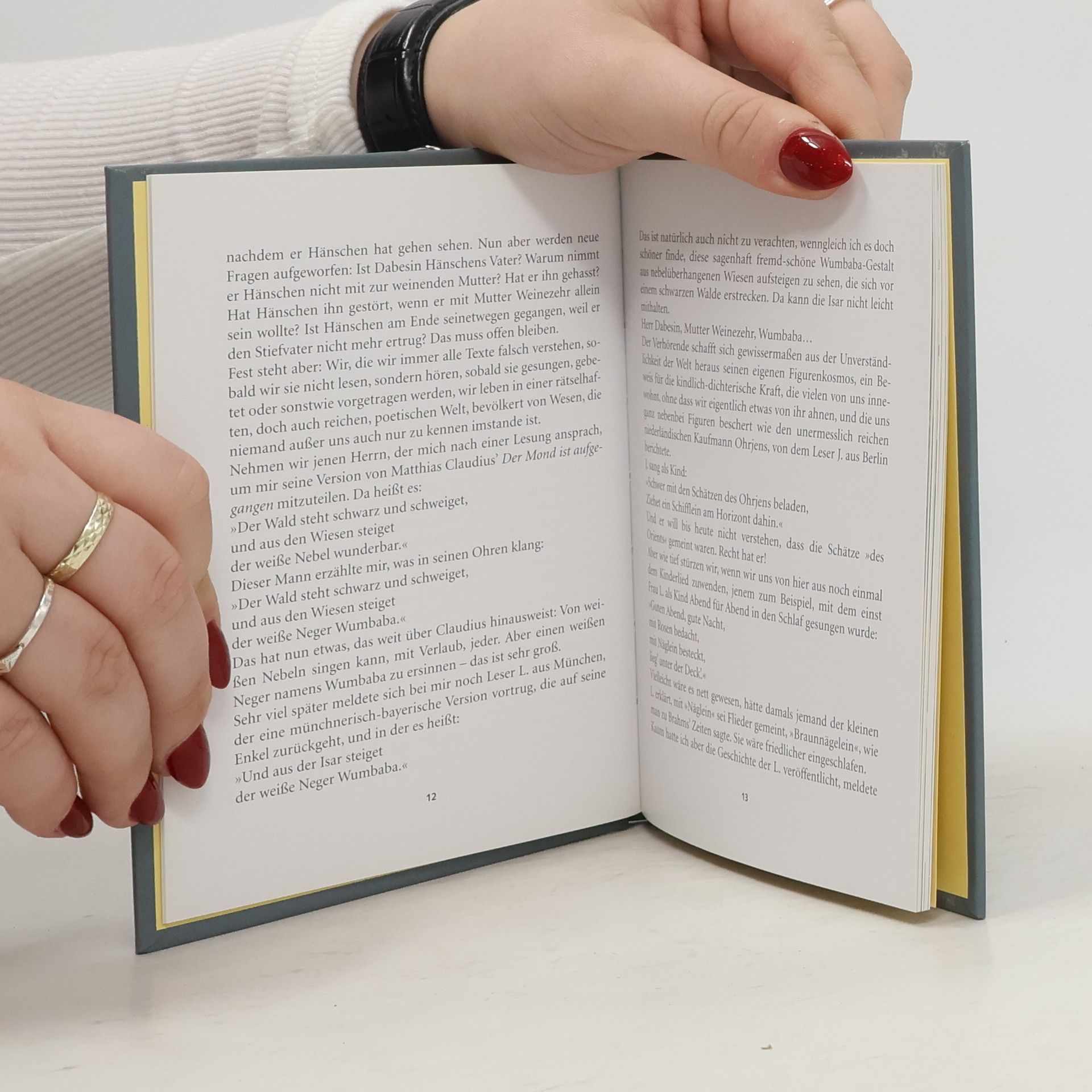 "Seit ich das erste Mal darüber schrieb, wie sehr Menschen Liedtexte falsch verstehen - wie etwa in eines Lesers Ohren Matthias Claudius' Zeile ›der weiße Nebel wunderbar‹ zu ›der weiße Neger Wumbaba‹ wurde und so eine unvergessliche, radikal poetische Traumgestalt entstand, deren Schöpfung Claudius selbst wohl nicht möglich war - erreichte mich eine solche Flut von Leserbriefen, gefüllt mit Beispielen für falsch verstandene Liedtexte, dass ich nun der Meinung bin: Im Grunde versteht kaum ein Mensch je einen Liedtext richtig, ja Liedtexte sind überhaupt nur dazu da, falsch verstanden zu werden. Aufgabe eines Liedtexters ist es, den Menschen Material zu liefern, damit ihre Phantasie wirken kann …"