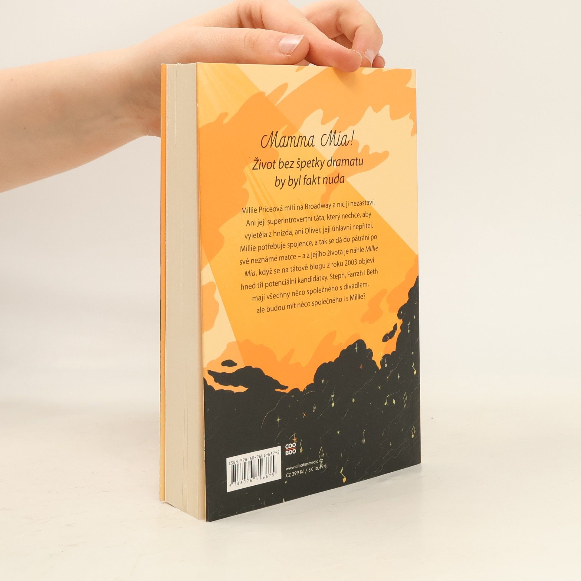 Mamma Mia! Život bez špetky dramatu by byl fakt nuda.Millie Priceová má sen, který nemůže nic překazit: stane se broadwayskou hvězdou. A nezabrání jí v tom ani její milý, ale superintrovertní táta, který Millie vychovává sám a nechce, aby vylétla z hnízda a vydala se za svým snem. A už vůbec ne její rival z dramaťáku Oliver, ke kterému ji možná i něco nevysvětlitelně přitahuje. Millie potřebuje spojence. A když táta zapomene vypnout počítač a ona tak omylem narazí na jeho blog z roku 2003, najednou je jasné, co musí udělat: najde svoji mámu.A tak tu máme Steph, která se pořád snaží prorazit jako herečka a přitom pracuje jako recepční v agentuře. A Farrah, ladnou učitelku tance, která očividně nemá obě nohy levé jako Millie. A Beth, veselou milovnici divadel se stejně nadšenou patnáctiletou dcerou (sestra?! To už se trochu vymyká z rukou!). Ale jak může člověk najít nový dílek života a předpokládat, že do skládačky toho starého zapadne, aniž by po něm zůstaly škrábance? A proč když jeden pátrá v minulosti, vždycky se nakonec vrátí k tomu, co měl celou dobu?
