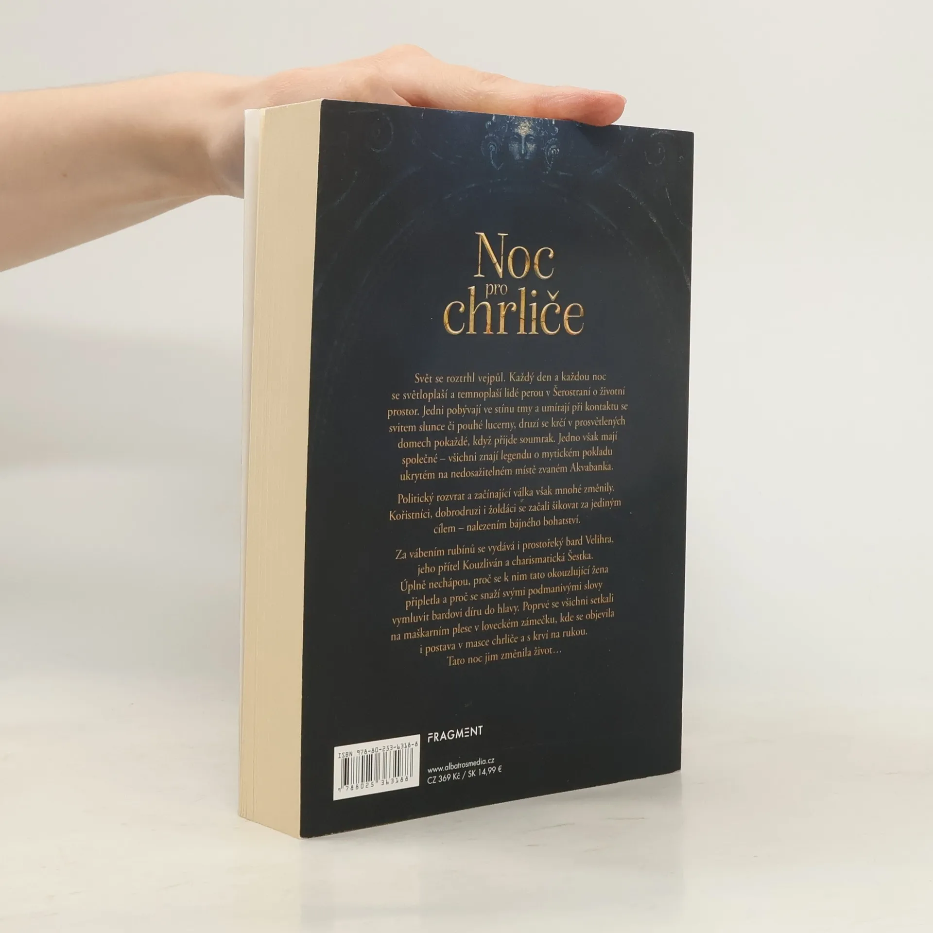 Svět se roztrhl vejpůl. Každý den a každou noc se světloplaší a temnoplaší lidé perou v Šerostraní o životní prostor. Jedni pobývají ve stínu tmy a umírají při kontaktu se svitem slunce či pouhé lucerny, druzí se krčí v prosvětlených domech pokaždé, když přijde soumrak. Jedno však mají společné – všichni znají legendu o mytickém pokladu ukrytém na nedosažitelném místě zvaném Akvabanka.Politický rozvrat a začínající válka však mnohé změnily. Kořistníci, dobrodruzi i žoldáci se začali šikovat za jediným cílem – nalezením bájného bohatství.Za vábením rubínů se vydává i prostořeký bard Velihra, jeho přítel Kouzliván a charismatická Šestka. Úplně nechápou, proč se k nim tato okouzlující žena připletla a proč se snaží svými podmanivými slovy vymluvit bardovi díru do hlavy. Poprvé se všichni setkali na maškarním plese v loveckém zámečku, kde se objevila i postava v masce chrliče a s krví na rukou. Tato noc jim změnila život...