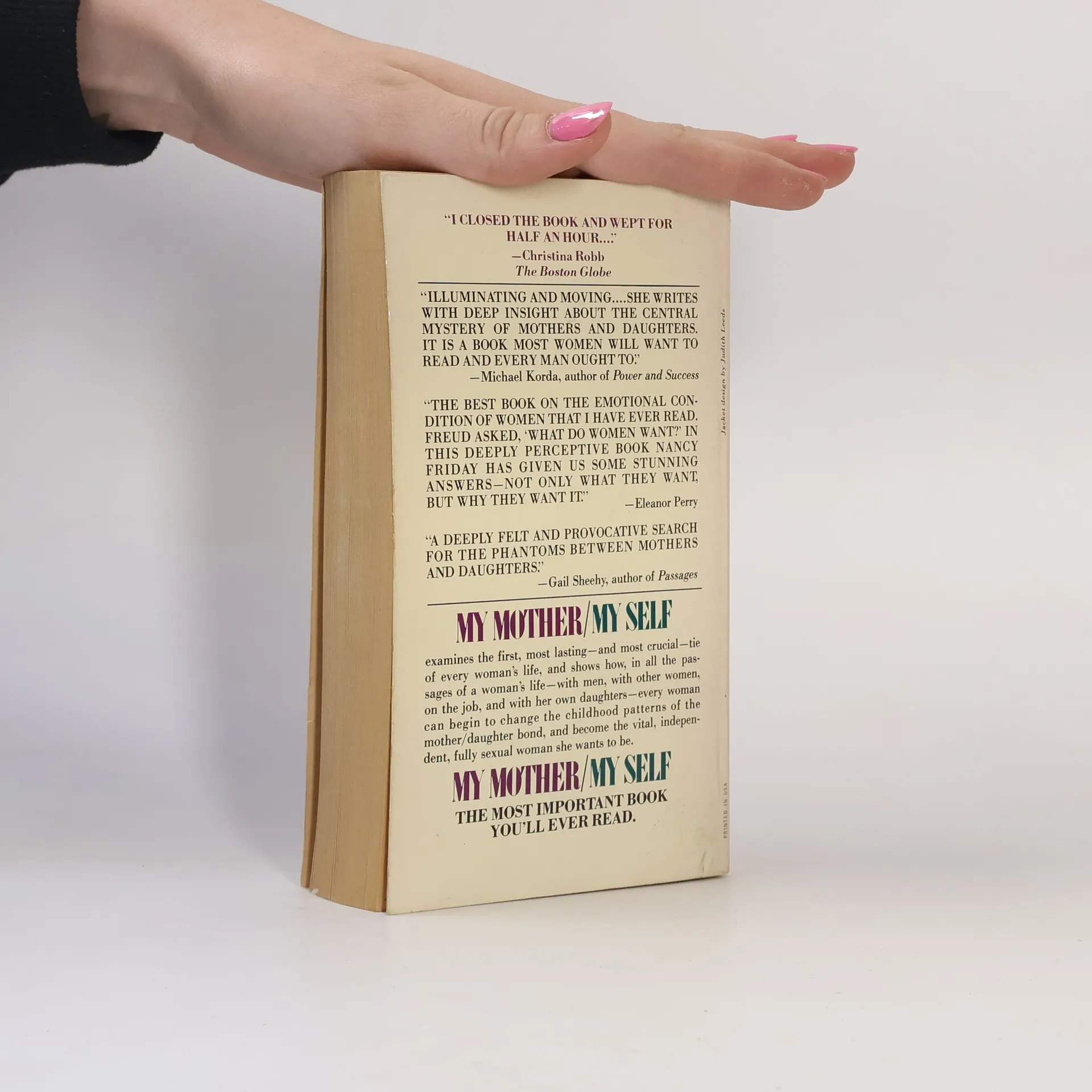 Nancy Friday shows that the key to a woman's character lies in her relationship with her mother - that first binding relationship which becomes the model for so much of a woman's adult relationships with men, and whose fetters constrain her sexuality, independence, and very selfhood.