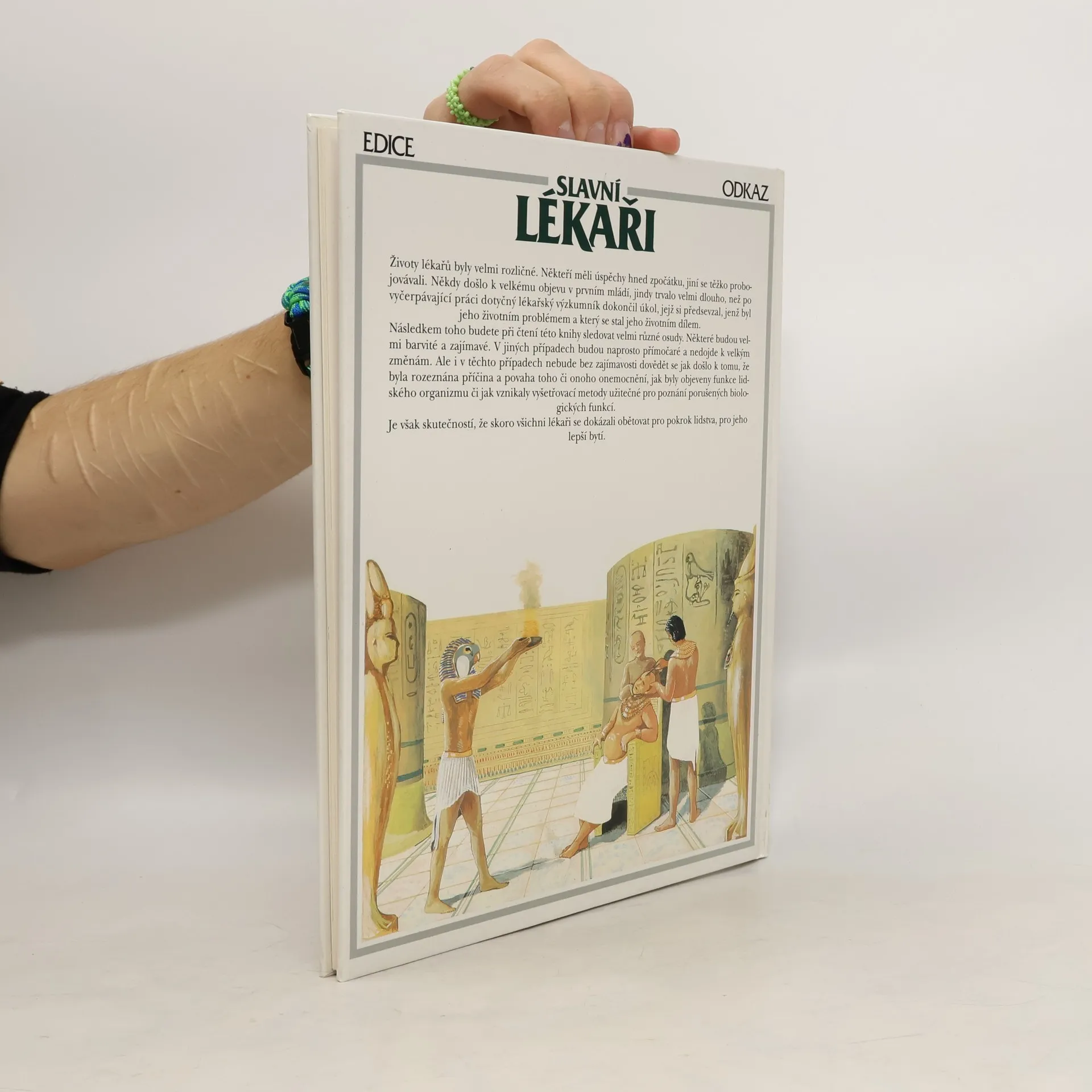 V knize se čtenáři seznámí s osudy nejznámějších lékařů dávné minulosti (počínaje Imhotepem a Hippokratem), přes plejádu lékařů-objevitelů 19. století, jakými byli např. L. Pasteur, W. K. Roentgen nebo I. P. Pavlov, až po slavné lékaře 20. století. Kromě osobností, které se zasloužily o významné lékařské objevy, jsou připomenuti i zakladatelé specializovaných oborů medicíny. Knihu uzavírá portrét slavného kardiochirurga Ch. Barnarda, který jako první na světě provedl transplantaci srdce. Z českých lékařů v knize naleznete životní příběh např. J. E. Purkyně, J. Thomayera nebo J. Janského.