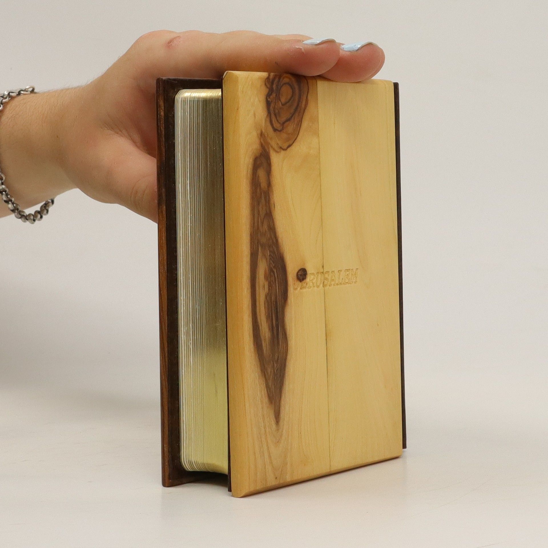 5-3/4" x 4-1/4" in size, bound in leatherette and olive wood. A special edition for visitors to the holy land, with many photographs of local scenes in full color. King James Version, red letter edition first published in 1961, with special maps and concordance c. 1984.