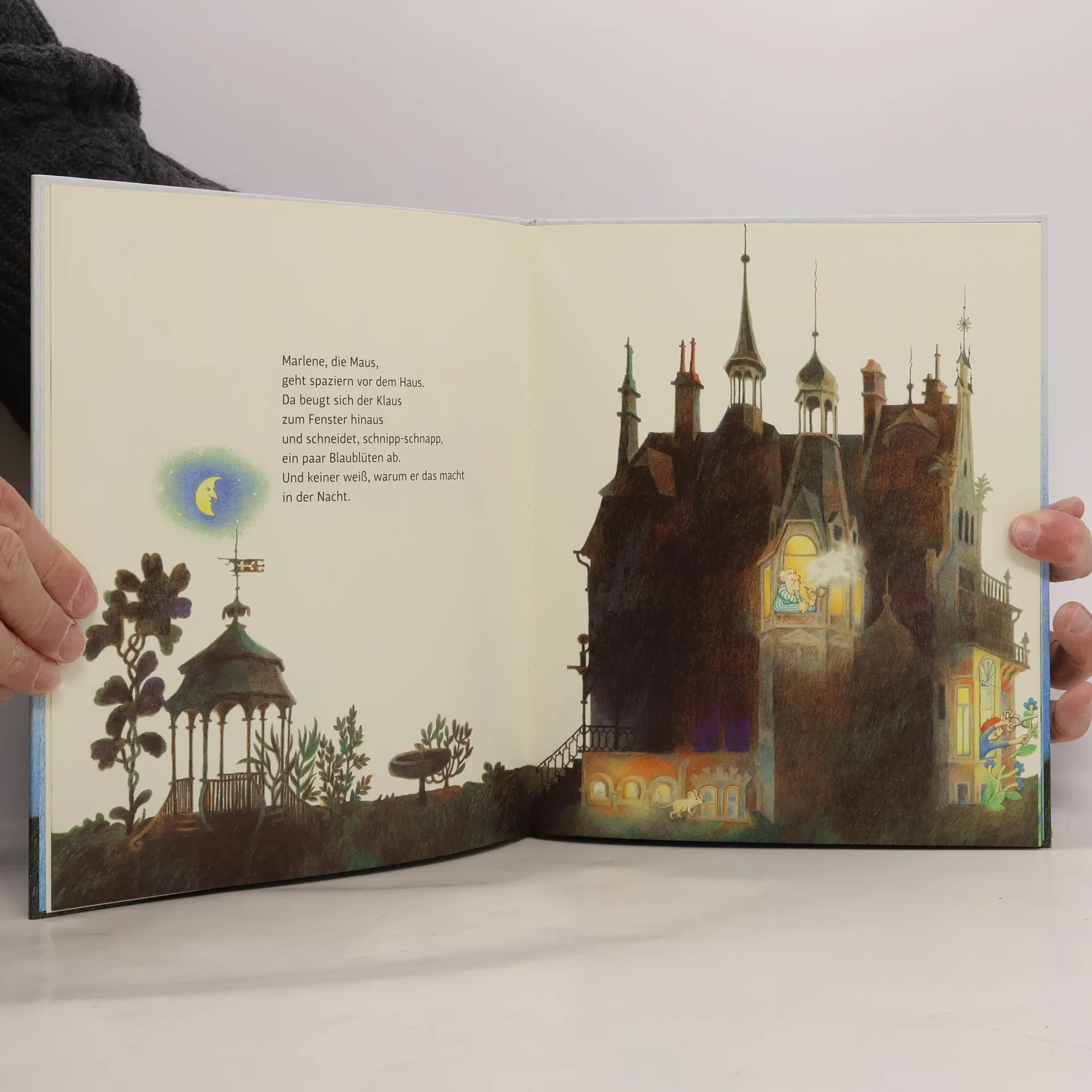 Still und dunkel steht das Haus da, alle schlafen. Nur die Maus Marlene ist wach. Dann kommt der alte Mugelmann, der wieder mal nicht schlafen kann. Und nach der Reihe tauchen alle auf: der Klaus, der Gärtner, der Fritz, die Fanni, der Clown, Frau Rundlich, der Mops, Habakuk und Nepomuk, die Ruth und die Wanda, und – als special guest – das Krokodil. Immer lauter wird’s und bunter, bis schließlich der Spuk zu Ende ist. Die Lichter gehen aus und das Haus steht wieder da wie am Anfang: still und dunkel.