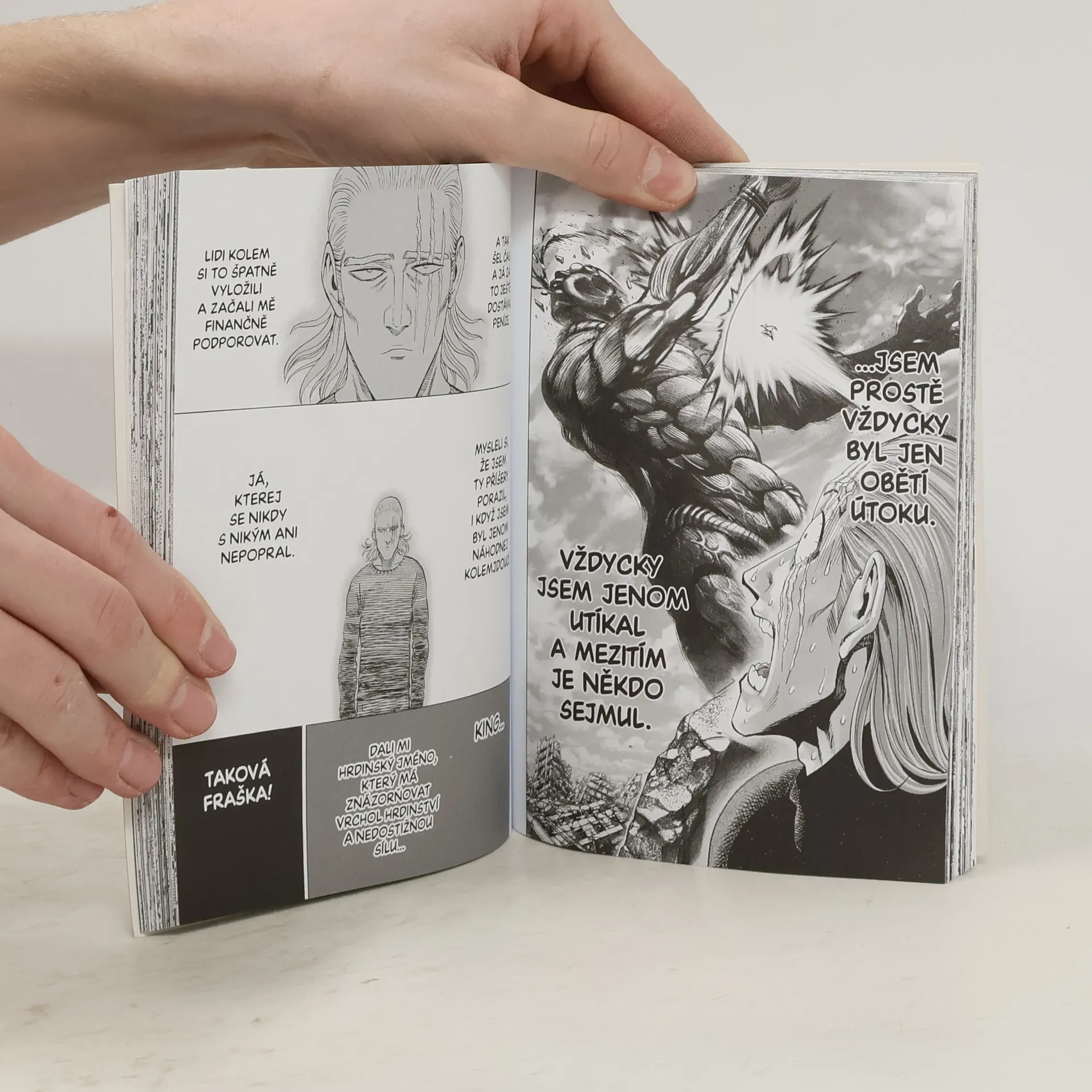 King je hrdina třídy S označovaný za nejsilnějšího muže na Zemi, před kterým se strachy třesou dokonce i příšery. A na něj nyní tajemná organizace posílá zabijáka... Pomůžou Kingovi z nejhoršího Saitama s Genosem?! Šokující Pravda o Kingovi vychází najevo!