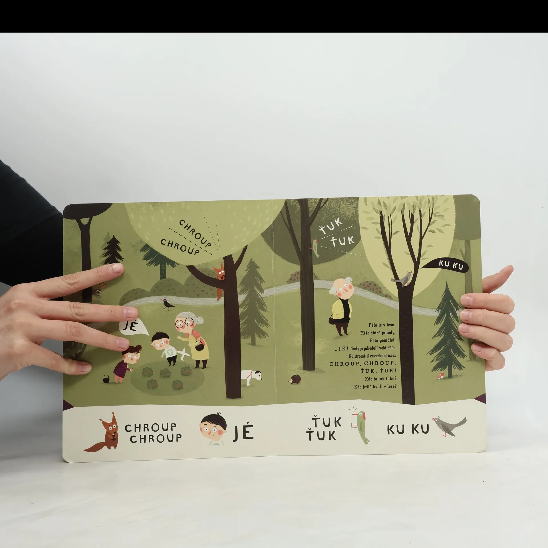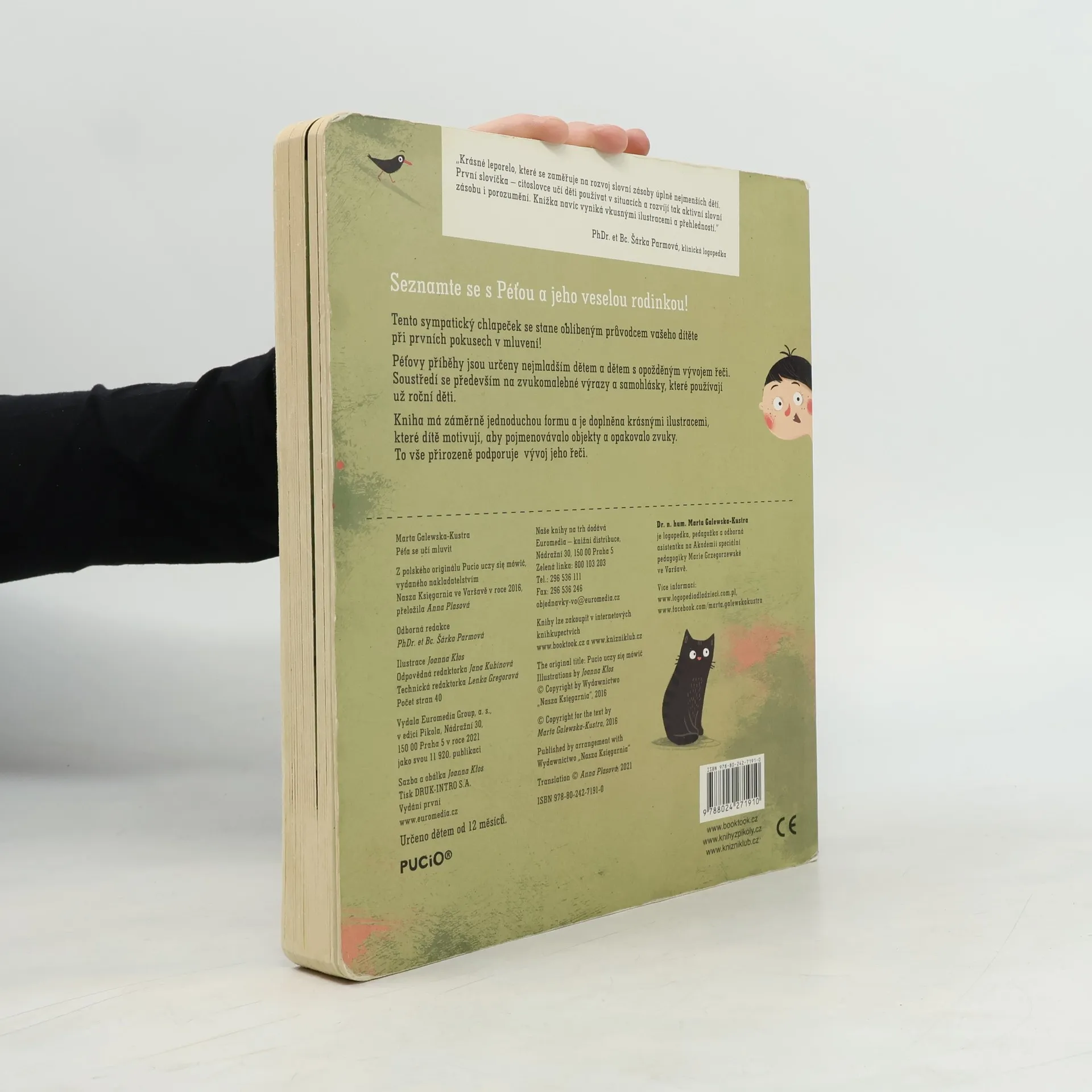 Seznamte se s Péťou a jeho veselou rodinkou! Krásně ilustrované leporelo se stane oblíbeným průvodcem při prvních krůčcích v mluvení. Soustředí se především na zvukomalebné výrazy a samohlásky, které používají už roční děti. Kniha má záměrně jednoduchou formu a je doplněna krásnými ilustracemi, které dítě motivují, aby pojmenovávalo objekty a opakovalo zvuky, což přirozeně vývoj jeho řeči podporuje. Leporelo je určeno dětem od 12 měsíců.