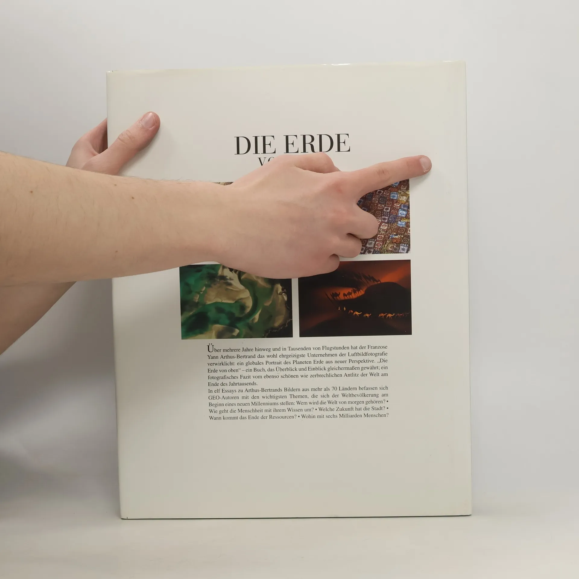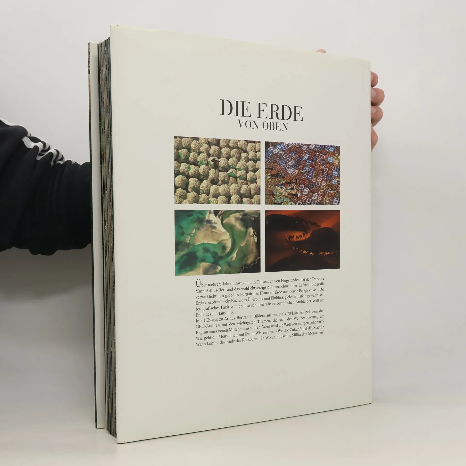 Über viele Jahre hinweg und in Tausenden von Flugstunden hat der Franzose Yann Arthus-Bertrand das wohl ehrgeizigste Unternehmen der Luftbildfotografie verwirklicht: ein globales Porträt des Planeten Erde aus neuer Perspektive. Die Erde von oben - ein Buch, das Überblick und Einblick gleichermaßen gewährt; ein fotografisches Fazit vom ebenso schönen wie zerbrechlichen Antlitz der Welt am Beginn eines neuen Jahrtausends. In zwölf Essays zu Arthus-Bertrands Bildern aus annähernd 80 Ländern befassen sich GEO-Autoren mit den wichtigsten Themen, die sich der Weltbevölkerung gegenwärtig stellen: Wem wird die Welt von morgen gehören? ( Wie geht die Menschheit mit ihrem Wissen um? ( Welche Zukunft hat die Stadt? ( Wann kommt das Ende der Ressourcen? ( Wohin mit sechs Milliarden Menschen?