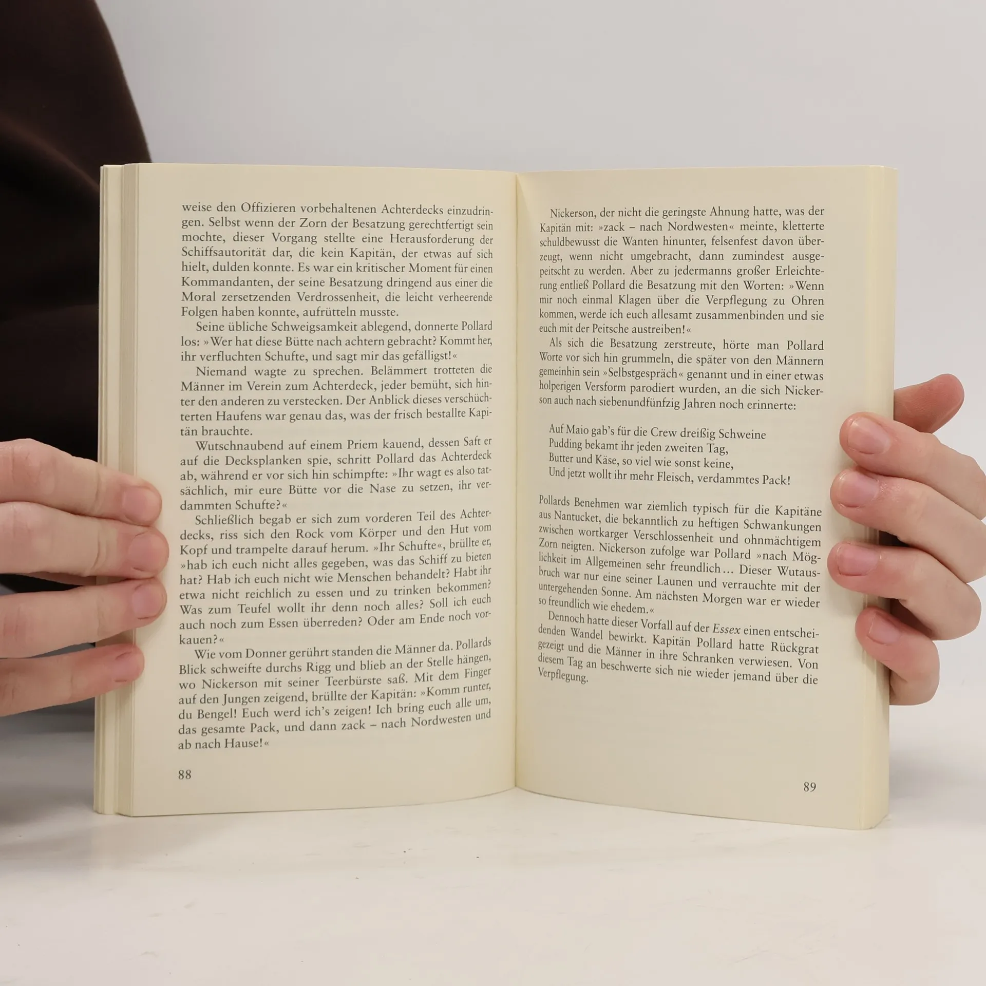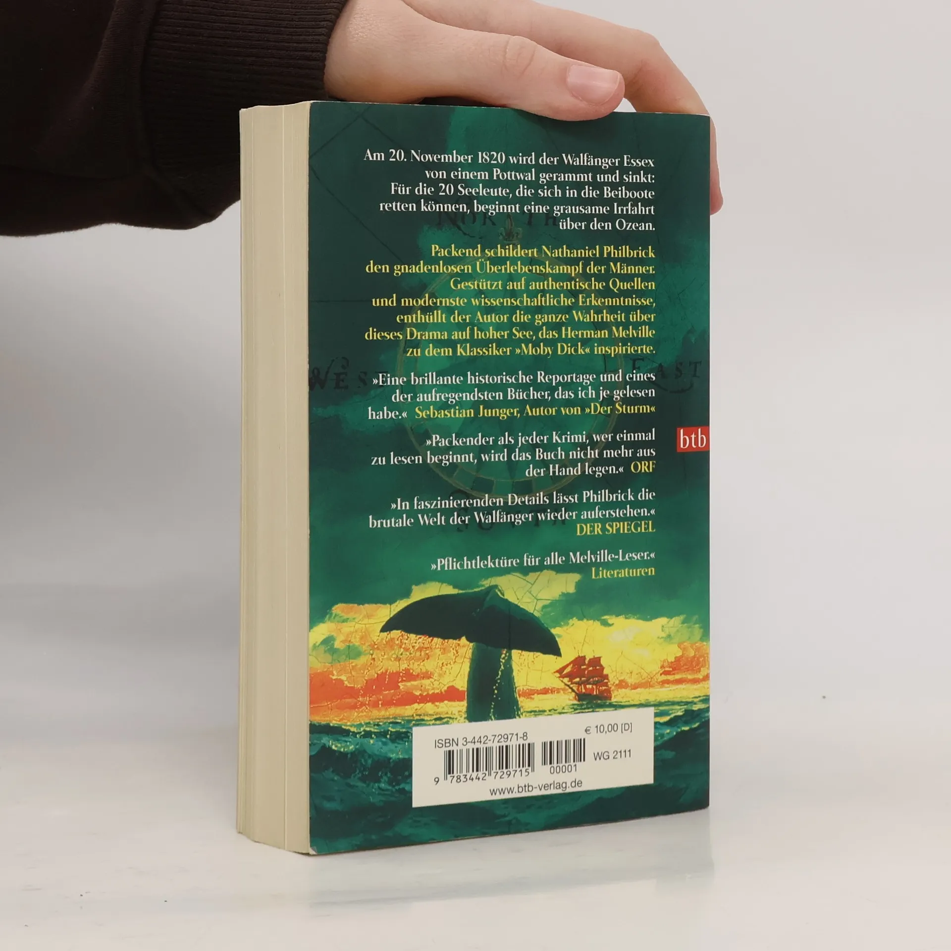 Als der Walfänger Essex im Sommer 1819 von der Insel Nantucket vor der Küste Neuenglands aufbricht, ahnt niemand, welche Tragödie die Crew erwartet. Im Februar 1821 greift die Dauphin vor der chilenischen Küste zwei völlig ausgemergelte, fast wahnsinnige Seeleute in einem kleinen ruderlosen Beiboot auf. Ende einer grausamen Odyssee über den Ozean, die ihren Anfang nahm, als die Essex von einem riesigen Pottwal gerammt wurde, und an deren Ende der Tod von zwölf Männern steht. Stürme, brennende Sonne und sogar die weitere Attacke eines Wals erwarten die Seeleute in den nächsten Wochen. Hunger und quälender Durst bringen die Männer an die Grenzen ihrer Kraft - und an die Grenzen ihrer Menschlichkeit. Nathaniel Philbrick schildert detailgenau den Überlebenskampf der Männer und beleuchtet die Hintergründe des Walfangs.