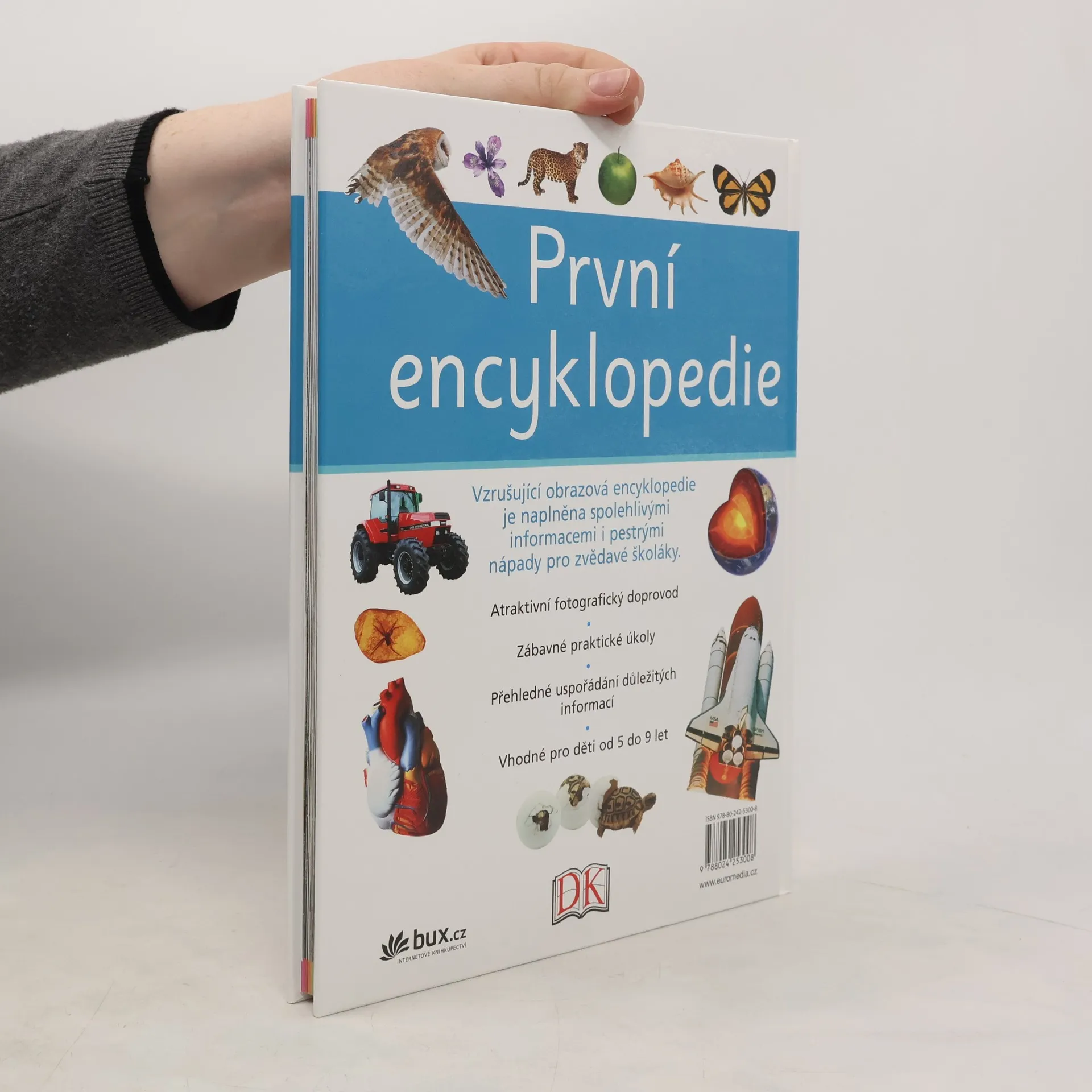 První encyklopedie seznamuje malé čtenáře s mnoha zajímavými fakty ze všech oblastí. Předkládá informace moderním způsobem, díky němuž dítě snadno najde, co potřebuje. Každá dvojstránka je zábavná, pestrá a přehledná. Výborné fotografie rozvíjejí znalosti ze všech oborů od zeměpisu a přírodopisu k dávné historii, světovým náboženstvím či moderním technologiím. Kapitoly doplňují zábavné praktické úkoly, které prohlubují zájem dětí o dané téma. Kniha je vhodná pro děti od 5 do 9 let.