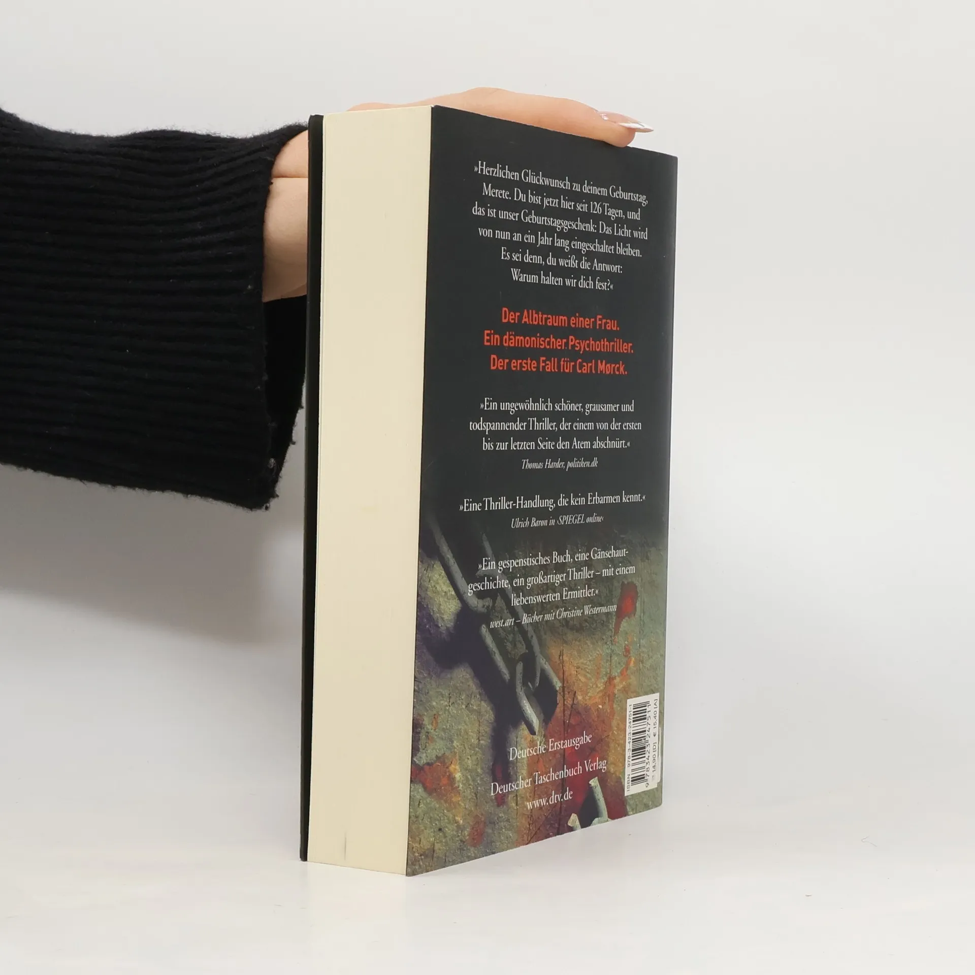 Und dann kam die Angst wie ein schleichendes Gift. Der Albtraum einer Frau.Ein dämonischer Psychothriller.Der erste Fall für Carl Mørckvom Sonderdezernat Q in Kopenhagen. Die verzerrte Stimme kam aus einem Lautsprecher irgendwo im Dunklen: »Herzlichen Glückwunsch zu deinem Geburtstag, Merete. Du bist jetzt hier seit 126 Tagen, und das ist unser Geburtstagsgeschenk: Das Licht wird von nun an ein Jahr lang eingeschaltet bleiben. Es sei denn, du weißt die Antwort: Warum halten wir dich fest?« Am 2. März 2002 verschwindet eine Frau spurlos auf der Fähre von Rødby nach Puttgarden, man vermutet Tod durch Ertrinken. Doch sie ist nicht tot, sondern wird in einem Gefängnis aus Beton gefangen gehalten. Wer sind die Täter? Was wollen sie von dieser Frau? Und: Kann ein Mensch ein solches Martyrium überleben? ››Ein ungewöhnlich schöner und hochspannender Thriller, der einem bis zur letzten Seite den Atem abschnürt.‹‹ politiken. dk Trailer ansehen auf www. adler-olsen. de