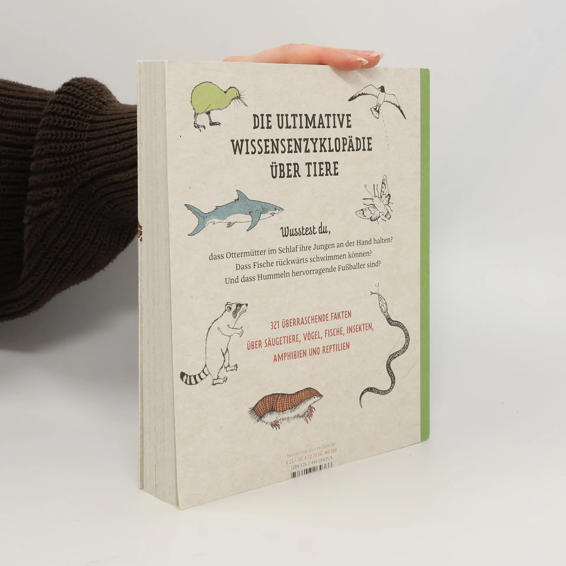 Band 2 des Bestsellers „321 superschlaue Dinge, die du unbedingt wissen musst“ mit überraschenden Fakten über Tiere Wusstest du, dass Hummeln hervorragende Fußballer sind? Und dass Weißwangengänse das Wetter vorhersagen können? Dass Hühner keinesfalls dumm sind? Dass Schlangen mit der Zunge riechen und Weiße Haie dreitausend Zähne haben? Und dass Ottermütter im Schlaf ihre Jungen an der Hand halten? Oder dass Elefanten Angst vor Bienen haben und Heringe mit Fürzen kommunizieren? 321 erstaunliche und amüsante Fakten über Säugetiere, Vögel, Fische, Insekten, Amphibien und Reptilien. Ein Wissensbuch, das nicht nur Kindern Spaß macht. Zum Lernen, Lachen und um andere zu verblüffen.